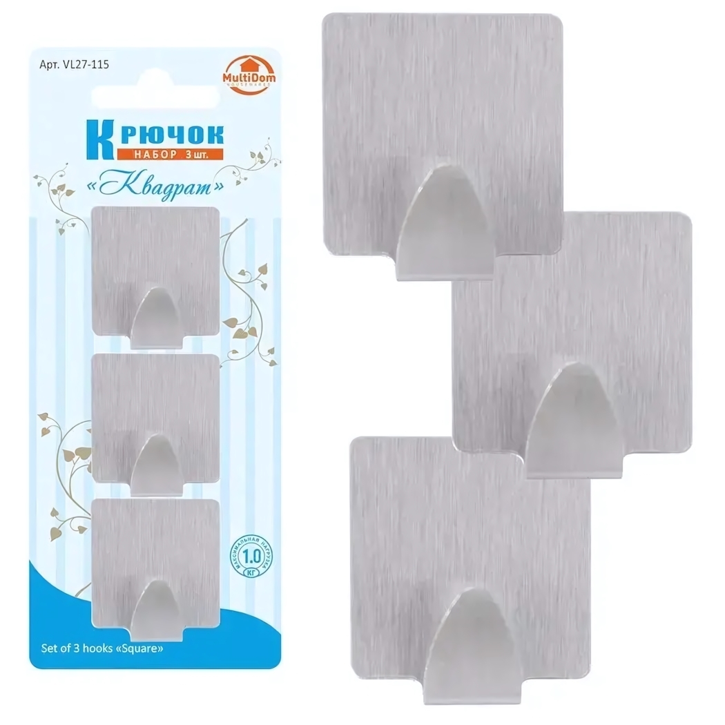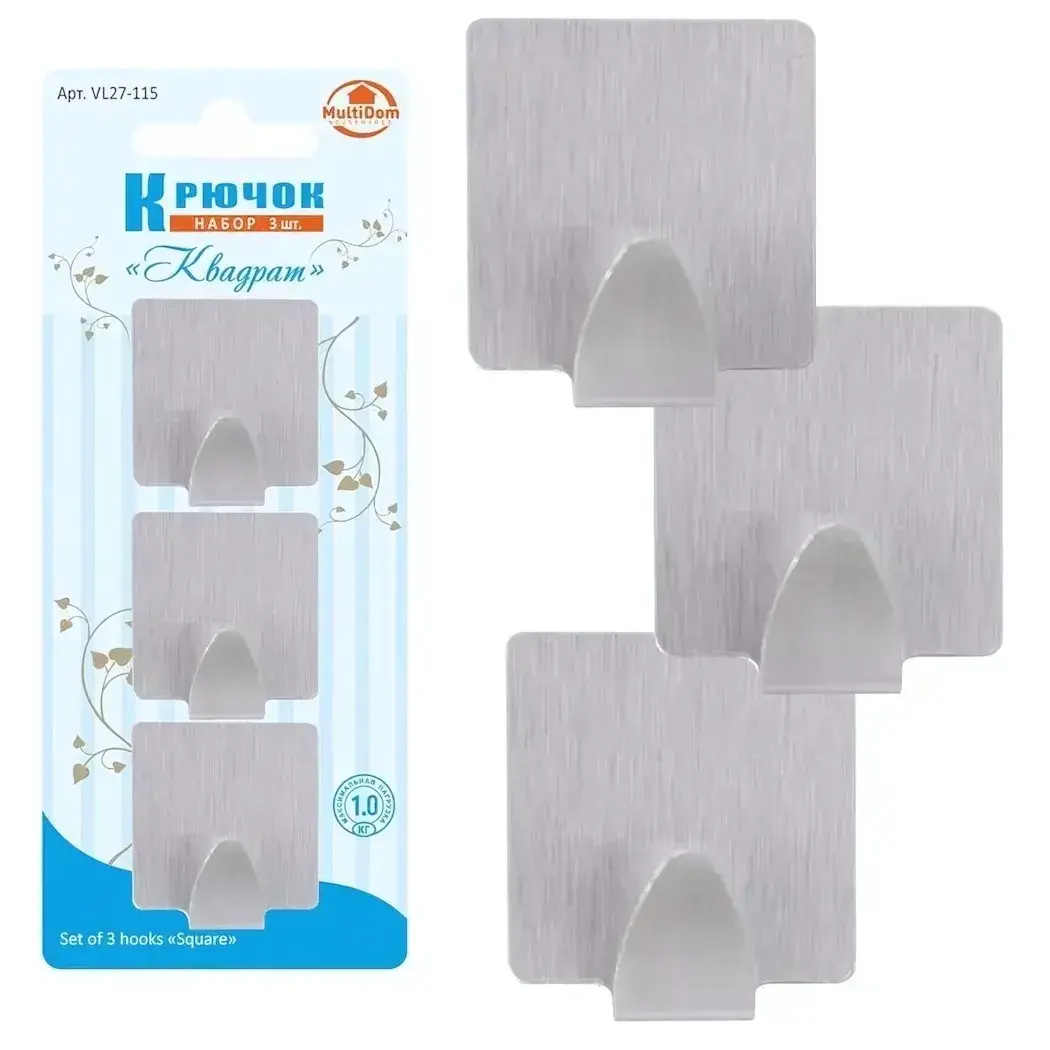 Крючок настенный самоклеющийся, набор 3шт, квадрат, металл матовый, 5х5см, до 1кг