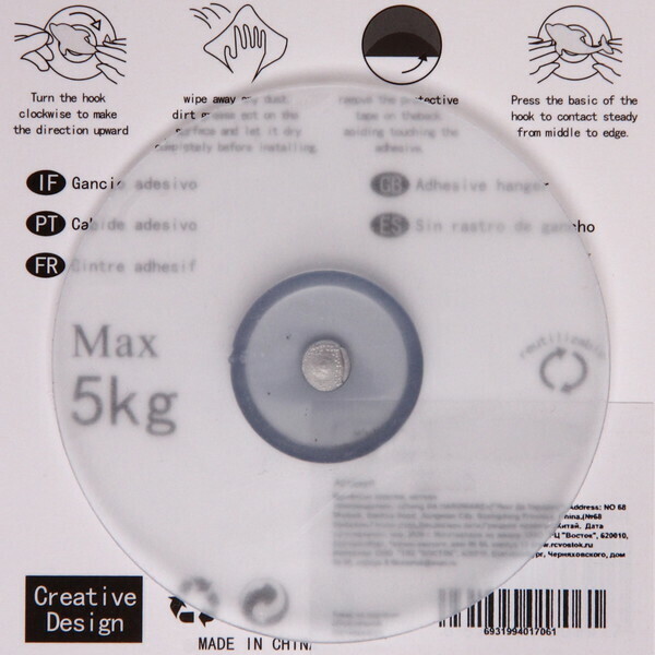 Крючок легко устанавливается на любую гладкую поверхность благодаря липкому слою. Просто очистите место установки, снимите защитную пленку и приклейте крючок. Он идеально подходит для использования в ванной, кухне или прихожей. Благодаря компактным размерам, он не занимает много места и подходит для любых интерьеров.
