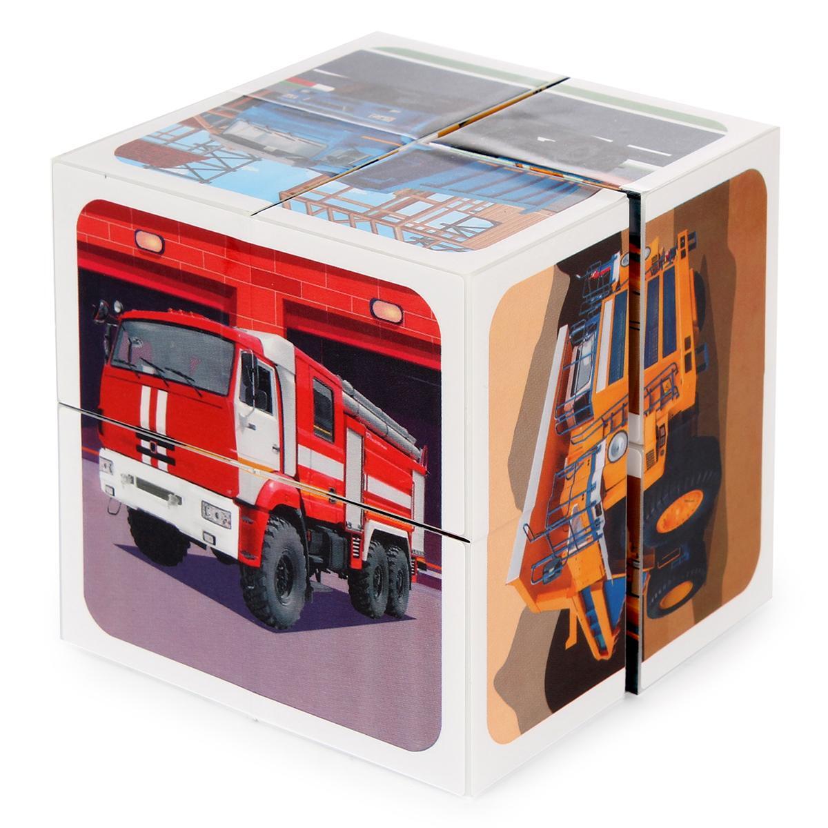Кубик упакован в термоусадочную пленку и представлен в картонной коробке размером 330 х 330 х 85 мм. Он состоит из шести граней, каждая из которых оформлена изображениями различных видов техники, таких как пожарные автомобили, грузовики и строительные машины. Это делает кубик не только игрушкой, но и развивающим элементом, который будет радовать вашего ребенка на протяжении долгого времени.