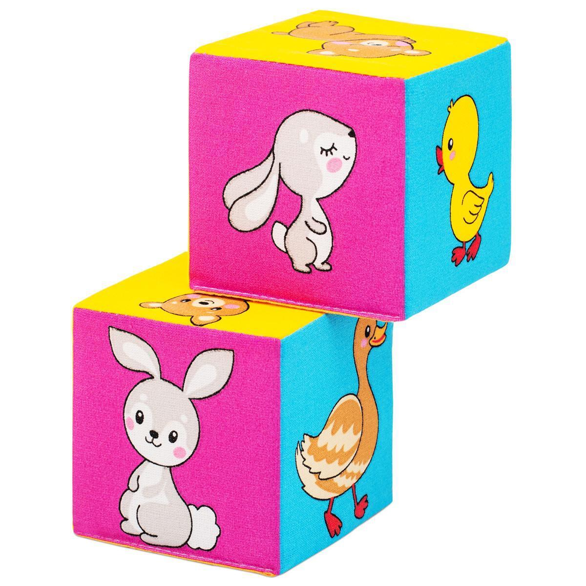 Каждый кубик выполнен из прочного и приятного на ощупь текстильного покрытия, внутри наполнен мягким синтепоном. На гранях изображены шесть пар животных: лисичка – малышка‑лисёнок, утка – утёнок, цыплёнок – малыш‑цыплёнок, котёнок – мама‑кошка, мишка – малыш‑медвежонок, зайка – мама‑заяц. Цветовая гамма кубиков сочетает жёлтый, розовый, синий и другие нежные тона, что делает их привлекательными и визуально разнообразными.