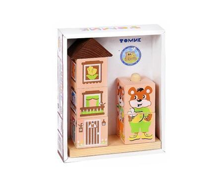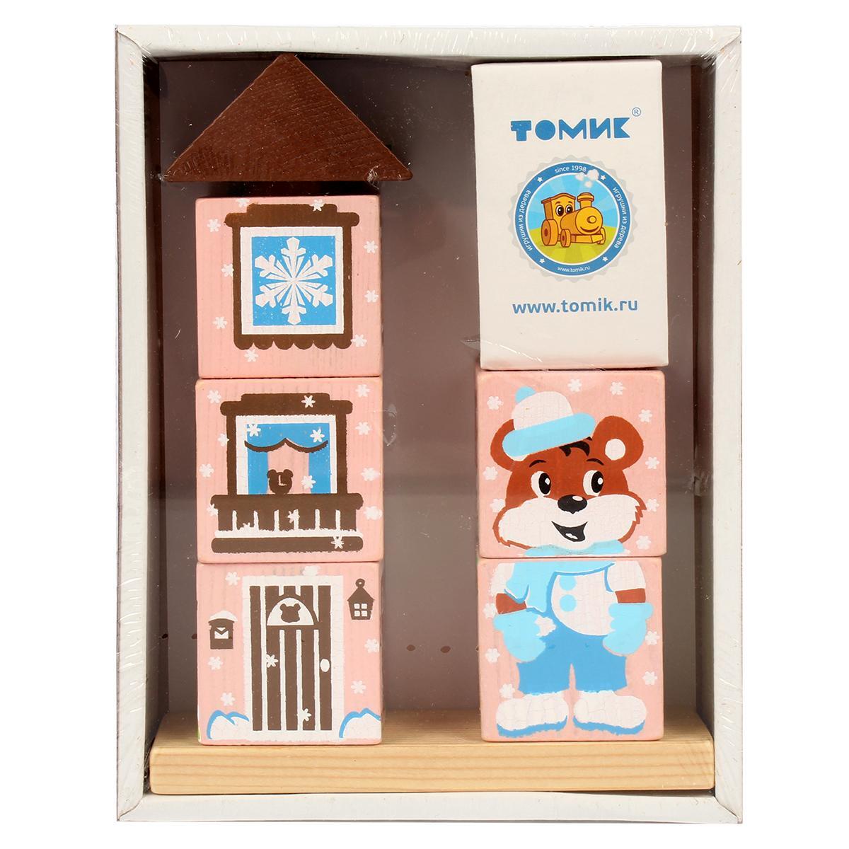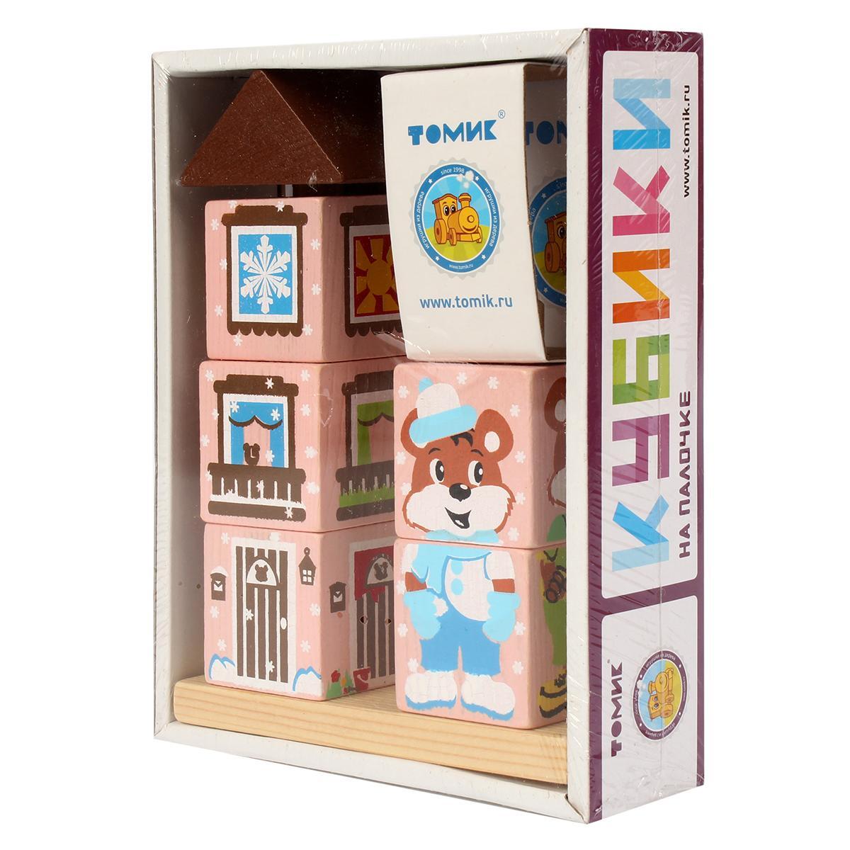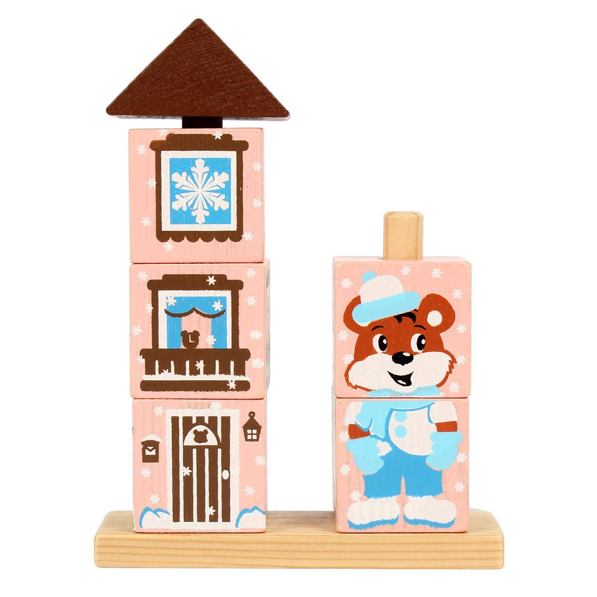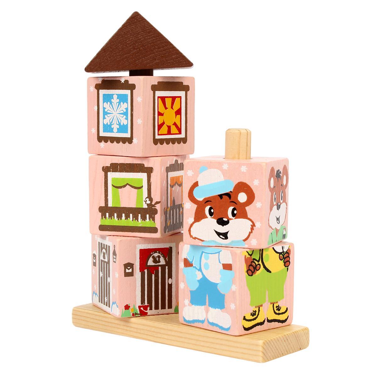 Кубики окрашены в нежные пастельные тона, что делает их привлекательными для детей. Каждый кубик имеет уникальный дизайн, включая изображения персонажей и элементов, таких как солнышко и снежинка. Они удобно располагаются на деревянной основе, что обеспечивает стабильность во время игры. Размеры кубиков идеально подходят для детских рук, что делает их легкими в использовании.