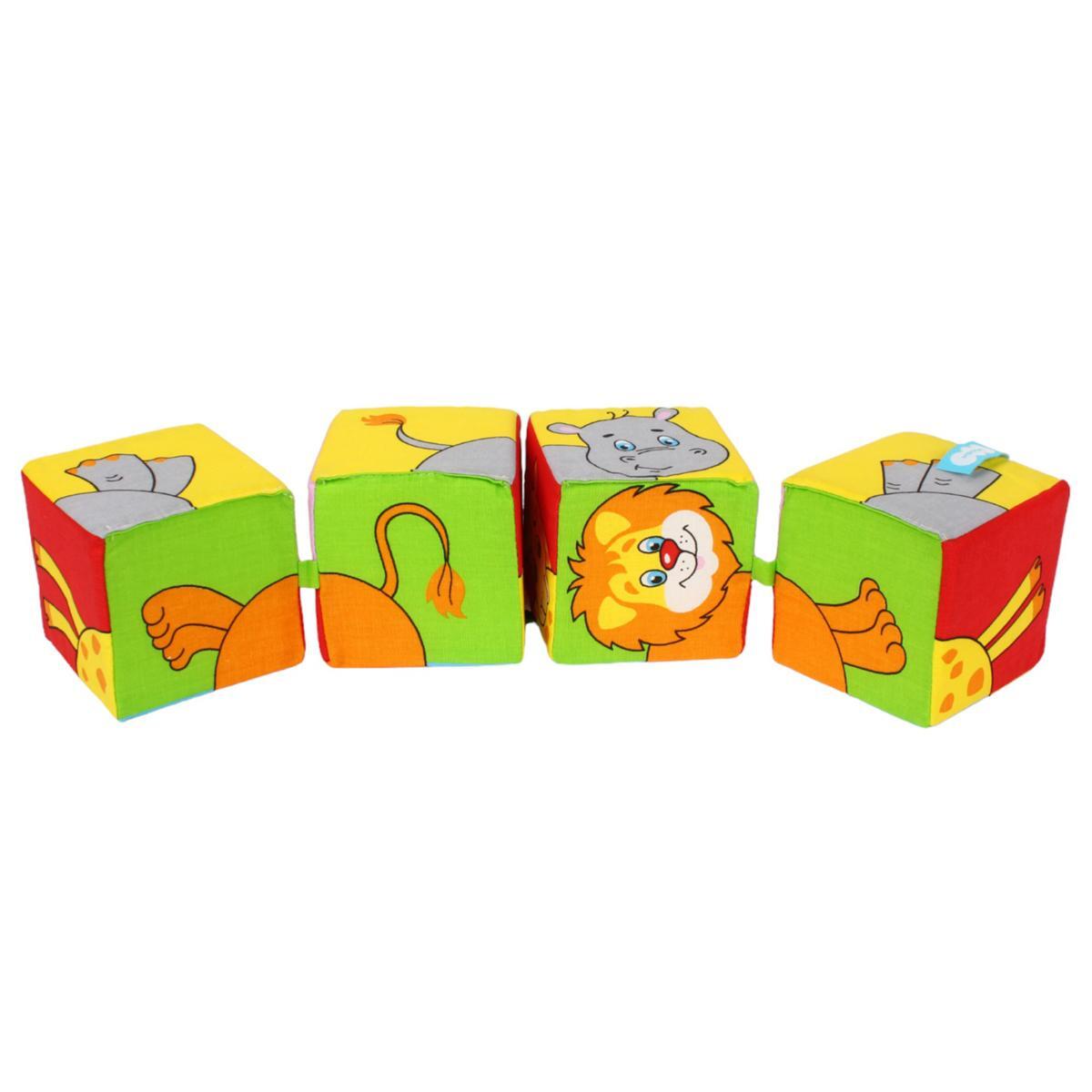 Каждый кубик украшен крупным рисунком животного – зебра, бегемот, обезьянка, жираф, львёнок или слон. С помощью тканевой перемычки кубики удобно соединяются в любые комбинации, позволяя собрать шесть разных сцен. Игра подходит для детей от 1 года и старше, а яркие цвета привлекут интерес даже самых маленьких исследователей.