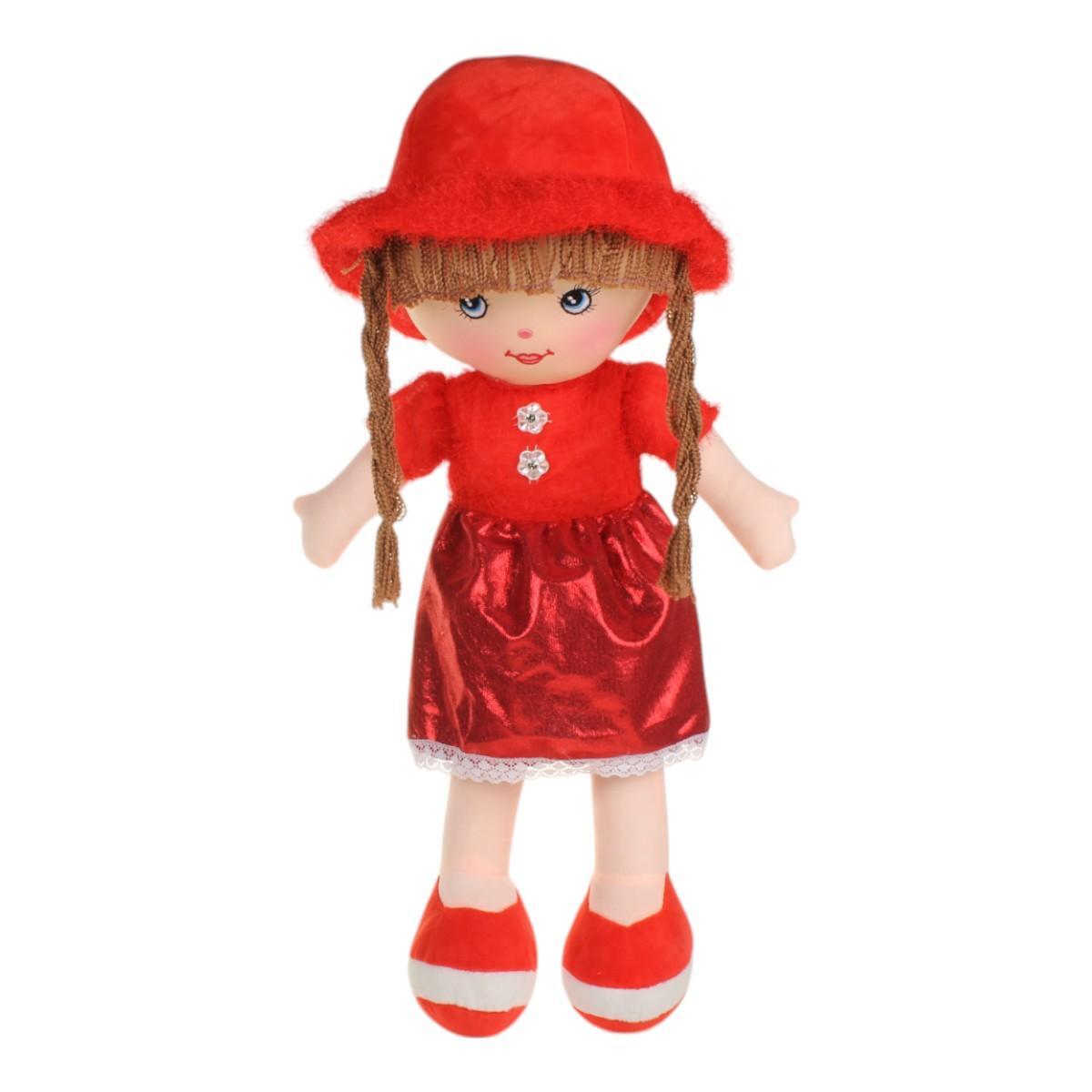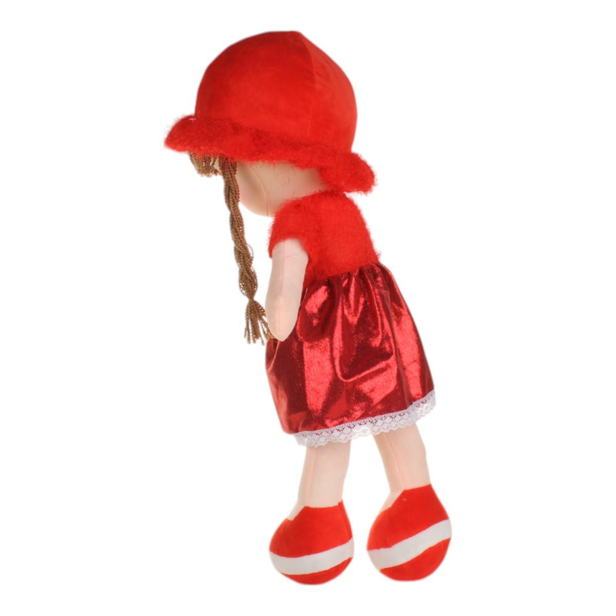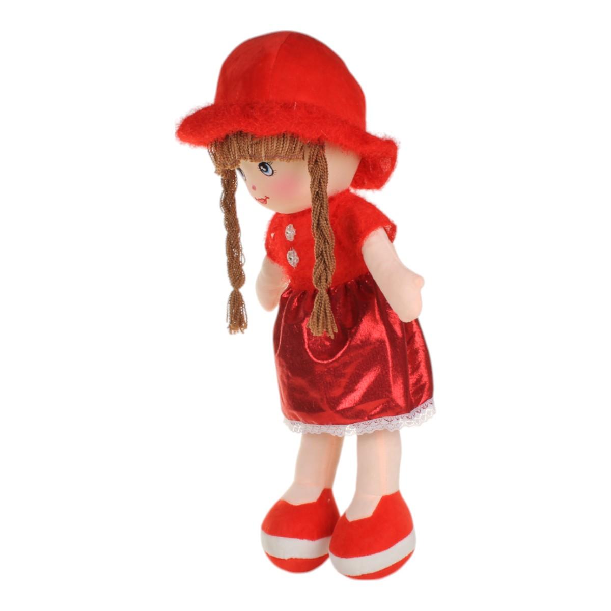 Размеры куклы составляют 25x58 см, что делает её удобной для обнимания и игры. Яркое красное платье с блестящей юбкой и красная шляпа добавляют ей очарования. Кукла имеет длинные косички, выполненные из безопасных синтетических волокон, что делает её еще более привлекательной для детей.