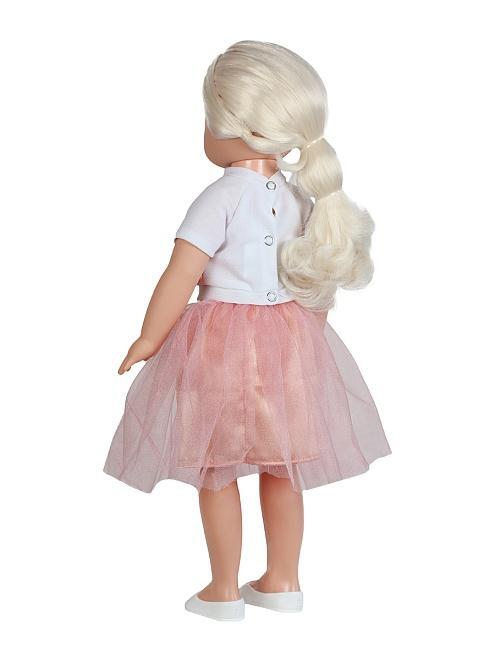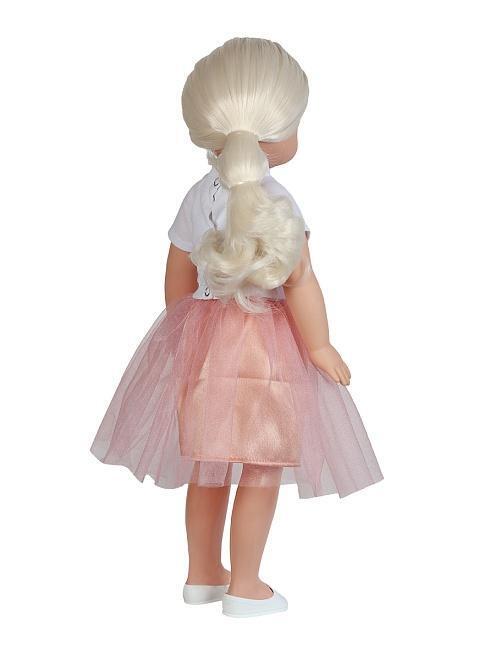 Кукла одета в стильную одежду: блузка, юбка, балетки — всё выполнено из качественных материалов и легко снимается/одевается, что удобно для частых игр и смены образов. Благодаря звуковому функционалу, при нажатии на животик, она произносит фразы, что стимулирует речевое развитие и взаимодействие.