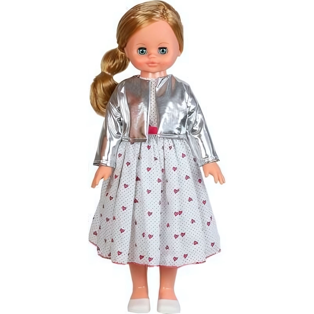 Кукла Алиса представлена в стильной одежде, которая включает серебристую куртку и платье с красными сердечками. Глаза куклы вставные и закрывающиеся, что придает ей реалистичный вид. Кукла стоит на ровной поверхности и имеет пропорциональное тело, что делает ее удобной для игры и создания различных образов.