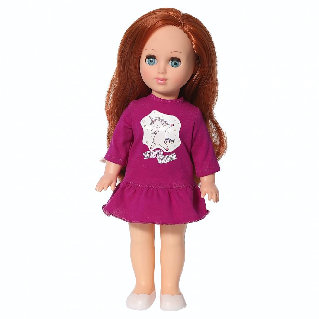 Кукла одета в трикотажное платье с ярким принтом «Звёздочка единорога» и белые туфельки. Образ выглядит современно и аккуратно, поэтому игрушка станет достойным подарком на день рождения, праздник или просто без повода.