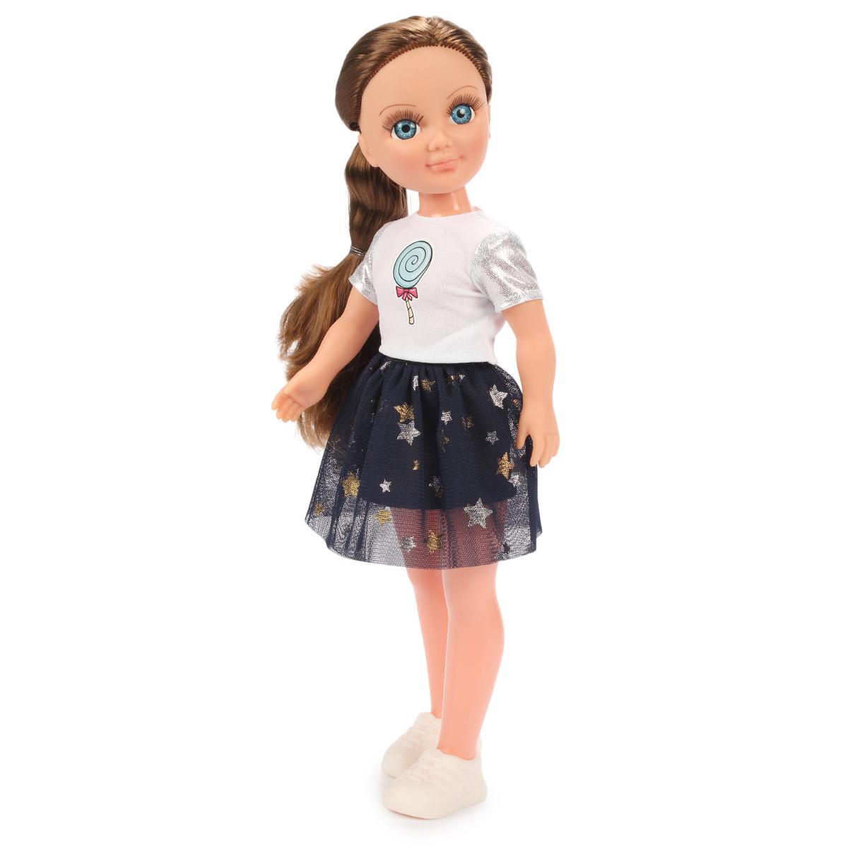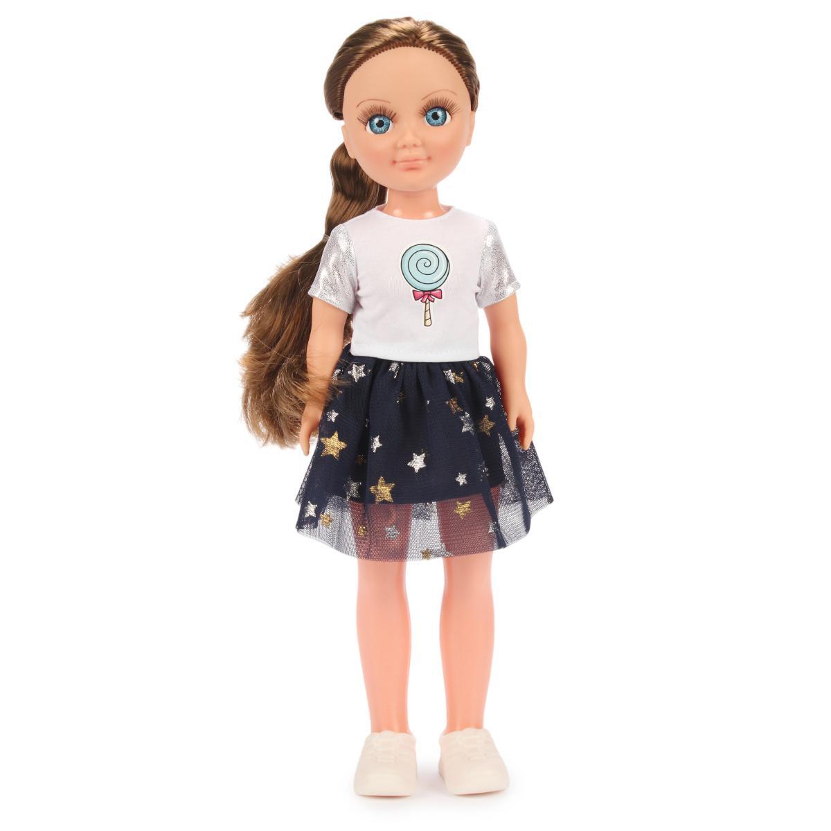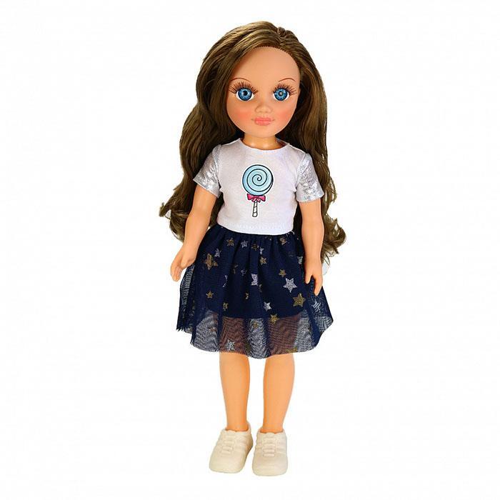 Кукла предназначена для детей от 3 лет и отлично подходит для игр как дома, так и на улице. Она выполнена из качественных материалов: винила, пластика и текстиля, что обеспечивает долговечность и безопасность. Анастасия Мисс Диско одета в белую футболку с аппликацией «леденец» и пышную юбку с золотыми звёздами, что делает её образ модным и современным.