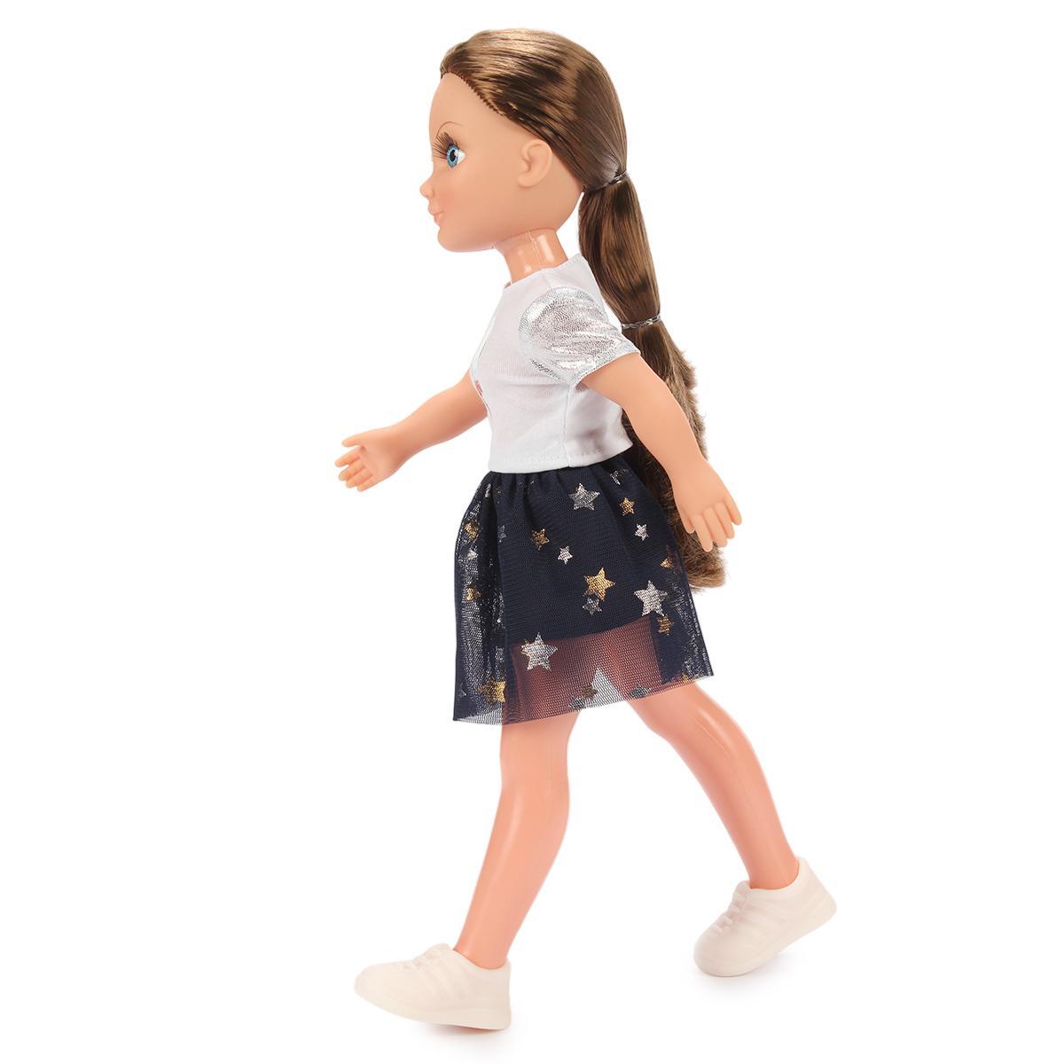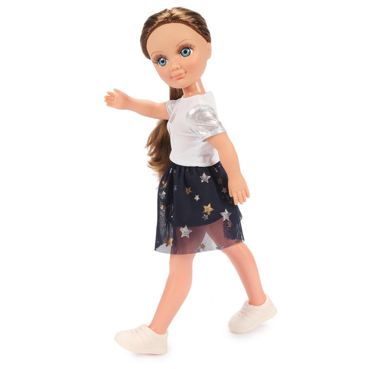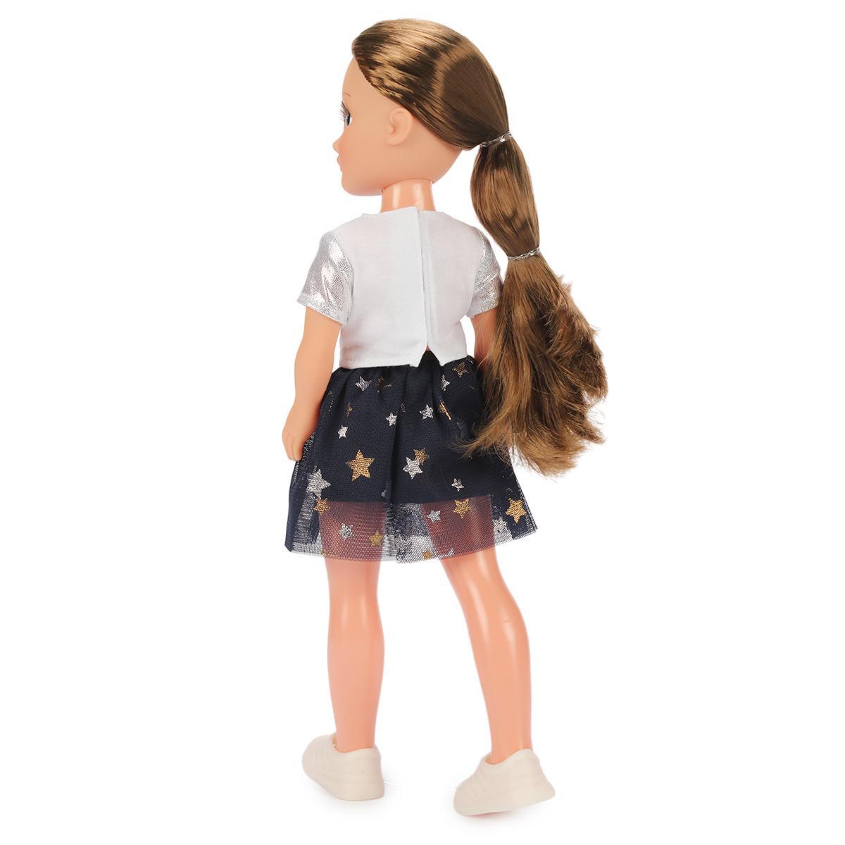 Кукла предназначена для детей от 3 лет и отлично подходит для игр как дома, так и на улице. Она выполнена из качественных материалов: винила, пластика и текстиля, что обеспечивает долговечность и безопасность. Анастасия Мисс Диско одета в белую футболку с аппликацией «леденец» и пышную юбку с золотыми звёздами, что делает её образ модным и современным.