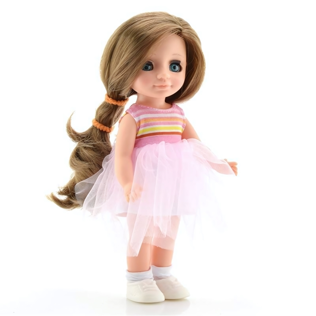 Кукла выполнена из твердых пластиковых компонентов и мягкой ткани, что обеспечивает долговечность и безопасность во время игр. Высота куклы — 26 см, она легко переносится и подходит для перевозки в сумке или рюкзаке. Волосы длинные, их можно расчёсывать и менять причёски, создавая новые образы. Одетая в симпатичный наряд из кофты и юбки, она подойдет для игр дома или на улице, помогая развивать воображение, тактильные навыки и аккуратность.