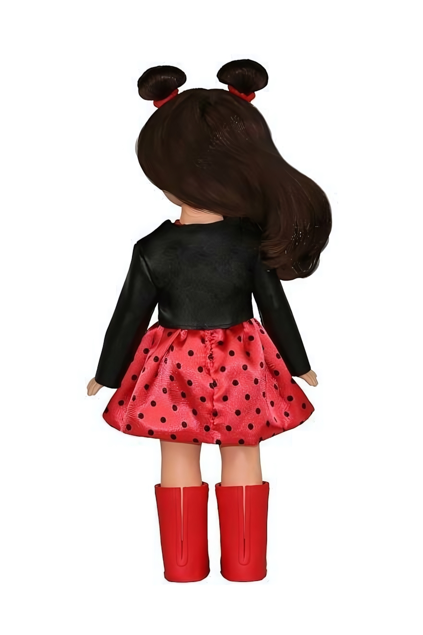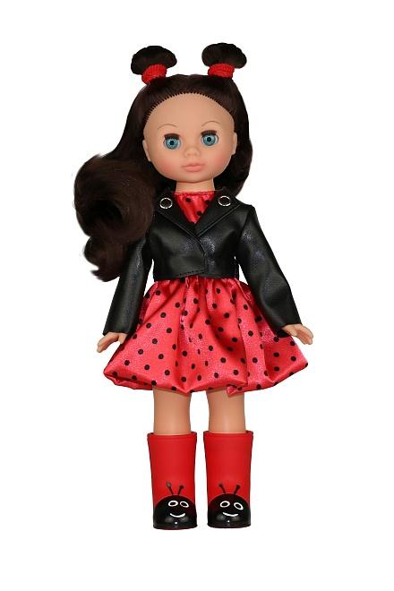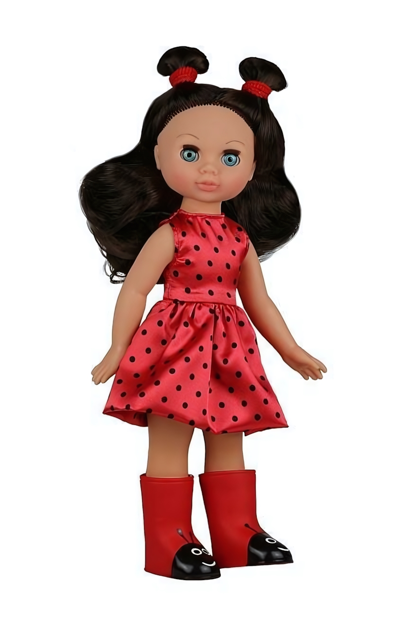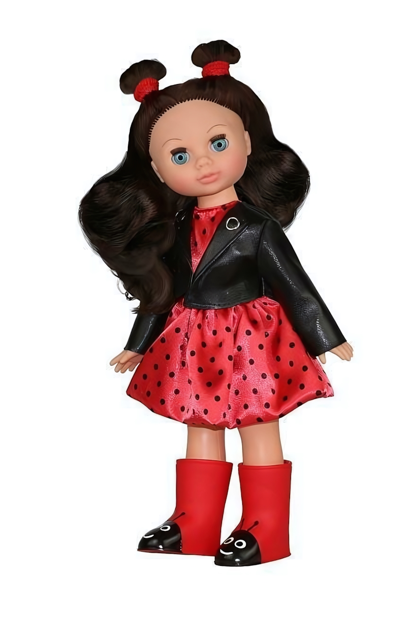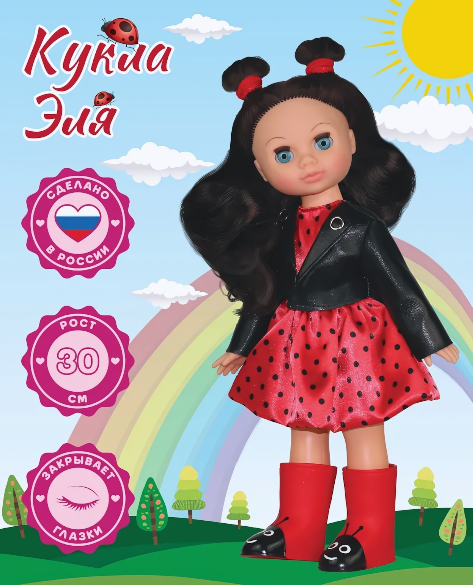 Кукла подходит для девочек от 3 лет и идеально подходит для сюжетно-ролевых игр. У Эли подвижные ручки и ножки, а также вставные закрывающиеся глазки, что позволяет укладывать её спать. Длинные шелковистые волосы можно расчёсывать и укладывать, создавая разнообразные прически. В комплект одежды входят: красное платье в горошек, кожаная куртка, резиновые сапожки с принтом «Божья коровка» и трусики. Образ дополняют хвостики-ушки с красными резиночками.