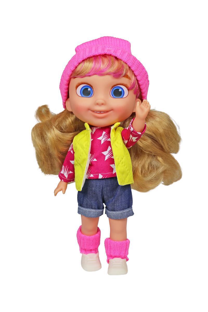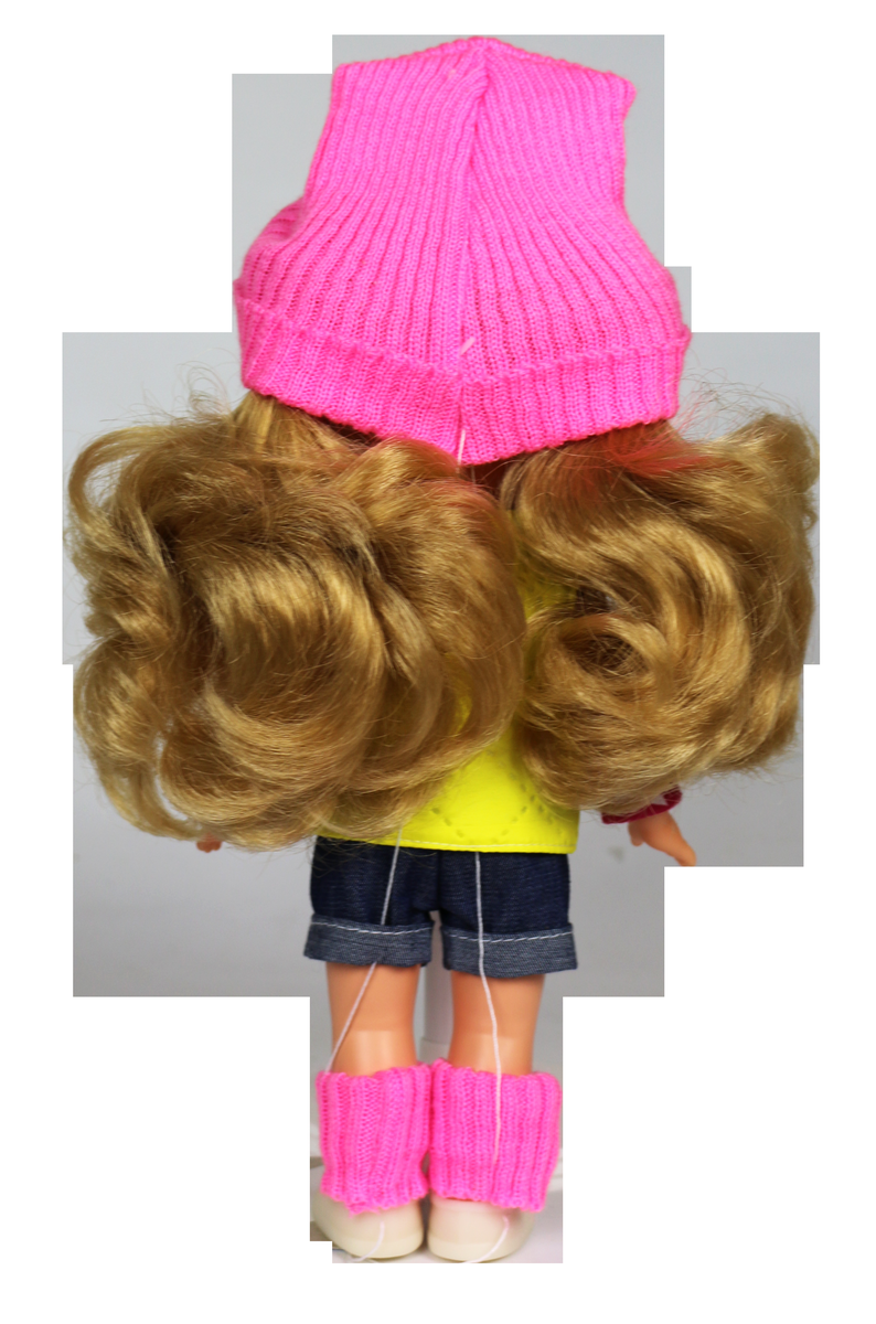 В набор входят: вязаная розовая шапка, джинсовые шорты, кроссовки, гетры и дополнительные аксессуары — гребешок и бутылочка. Все элементы одежды легко снимаются, что развивает мелкую моторику.
