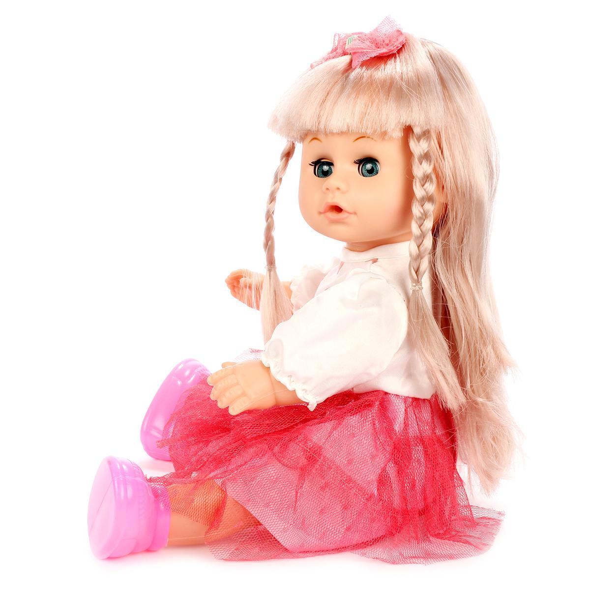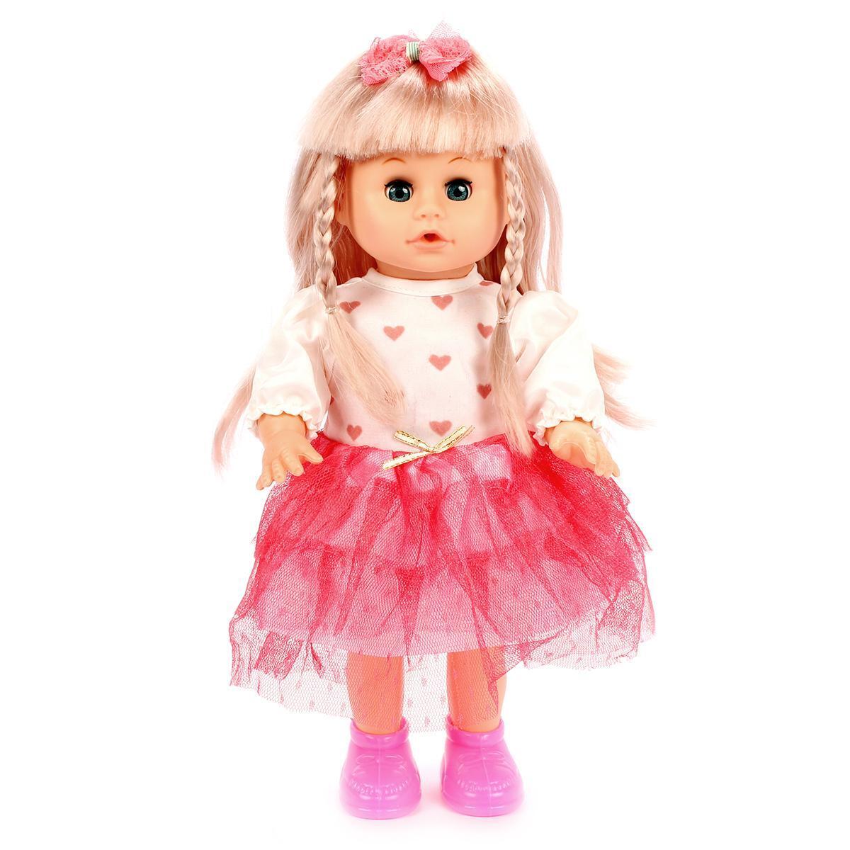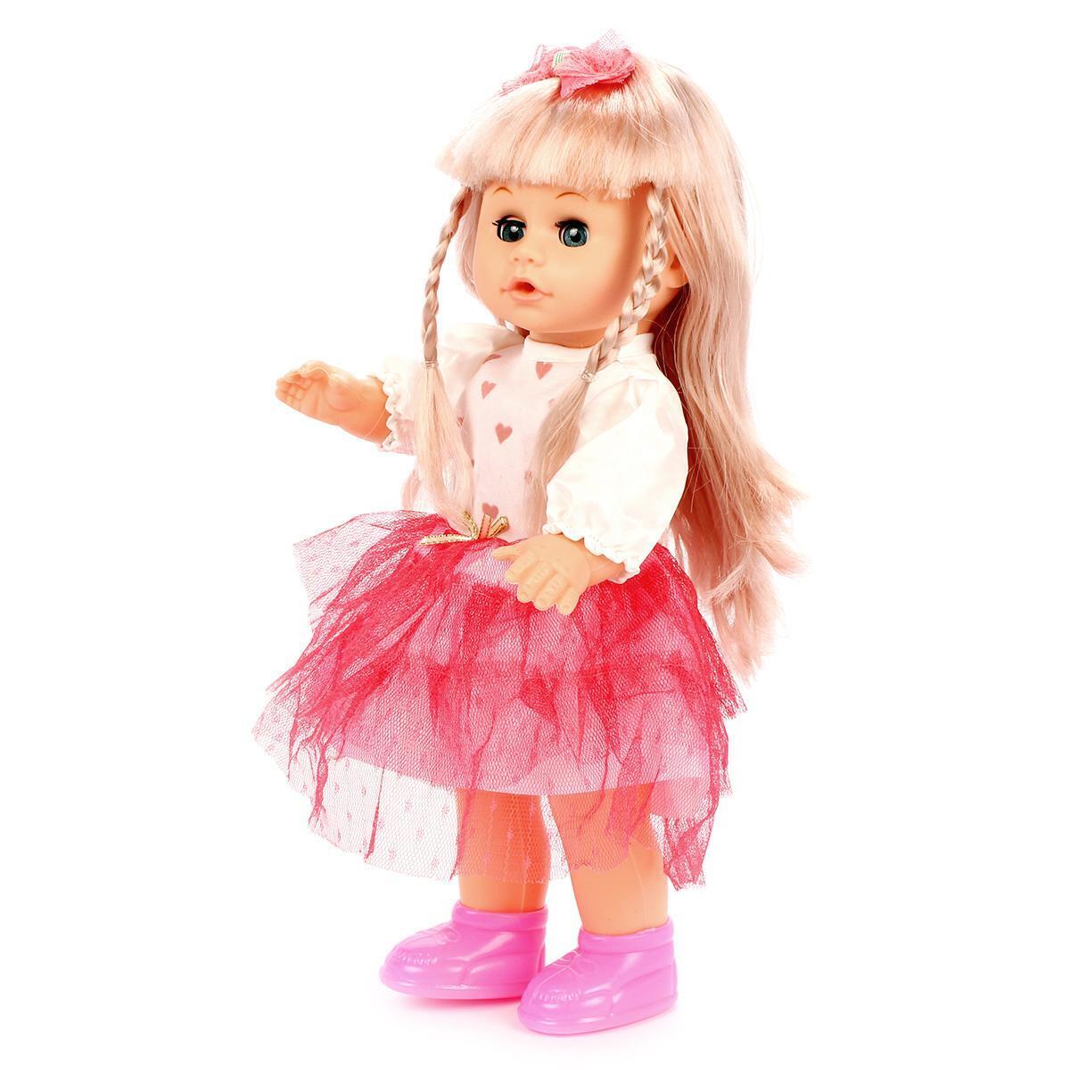 Кукла одета в белую блузку с сердечками и розовую юбку из тюля, а также носит ярко-розовые туфли. Ее большие голубые глаза и милое выражение лица делают ее еще более привлекательной для детей. Убедитесь, что перед игрой вы удалили заглушку на крышке блока с батарейками, чтобы активировать звуковые функции.