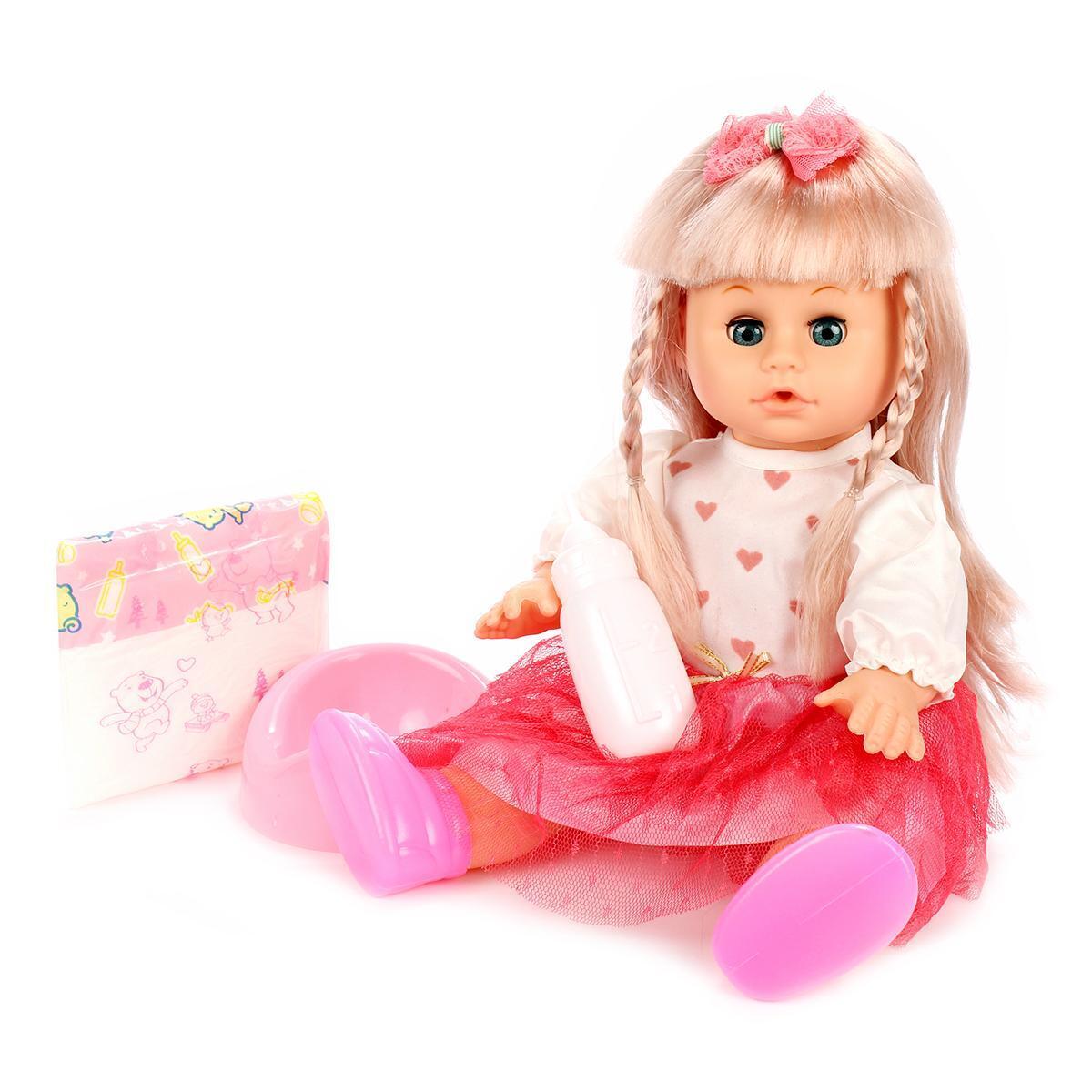 Кукла высотой 34 см выполнена из качественных полимерных и текстильных материалов, что обеспечивает ее долговечность и безопасность для детей от 3 лет. В комплект входят аксессуары: горшок, бутылочка и памперс, что позволяет девочке попробовать себя в роли заботливой мамы. Чтобы начать игру, достаточно наполнить бутылочку водой и напоить куклу, после чего можно посадить ее на горшок.