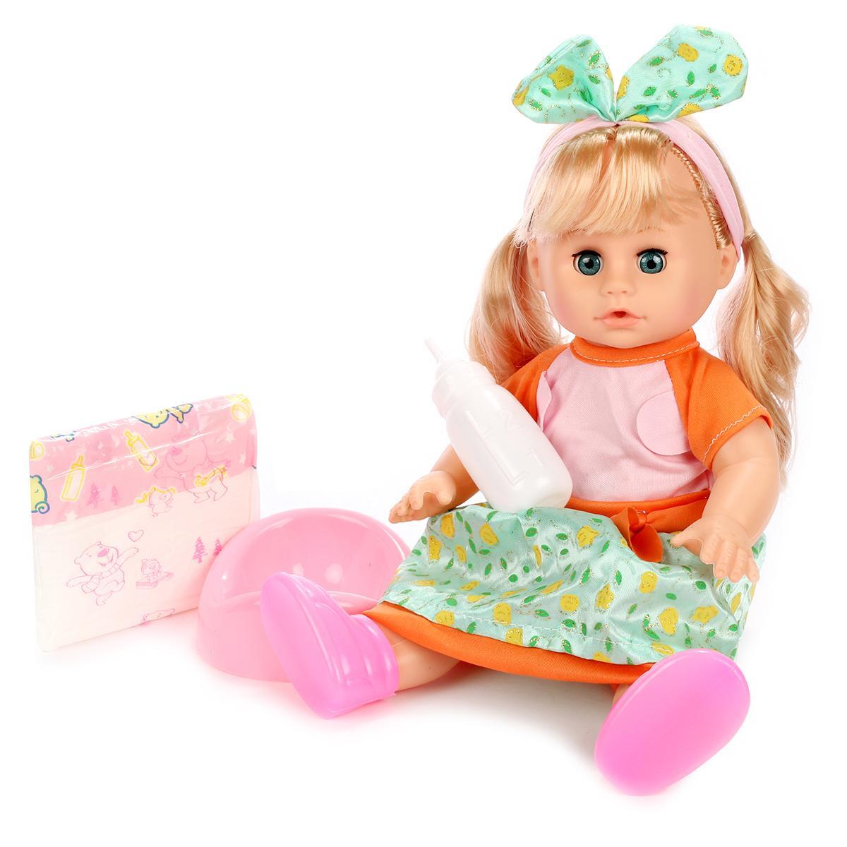 Кукла оснащена звуковыми эффектами: при нажатии на животик она произносит слова 'мама' и 'папа', а также издает звуки, такие как смех, плач и вздохи. Это позволяет девочкам почувствовать себя настоящими мамами, заботясь о своей кукле. В комплект входят аксессуары: горшок, бутылочка и памперс, что делает игру еще более интересной и разнообразной.