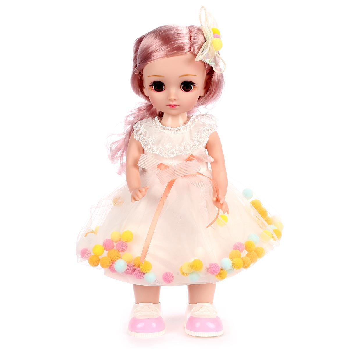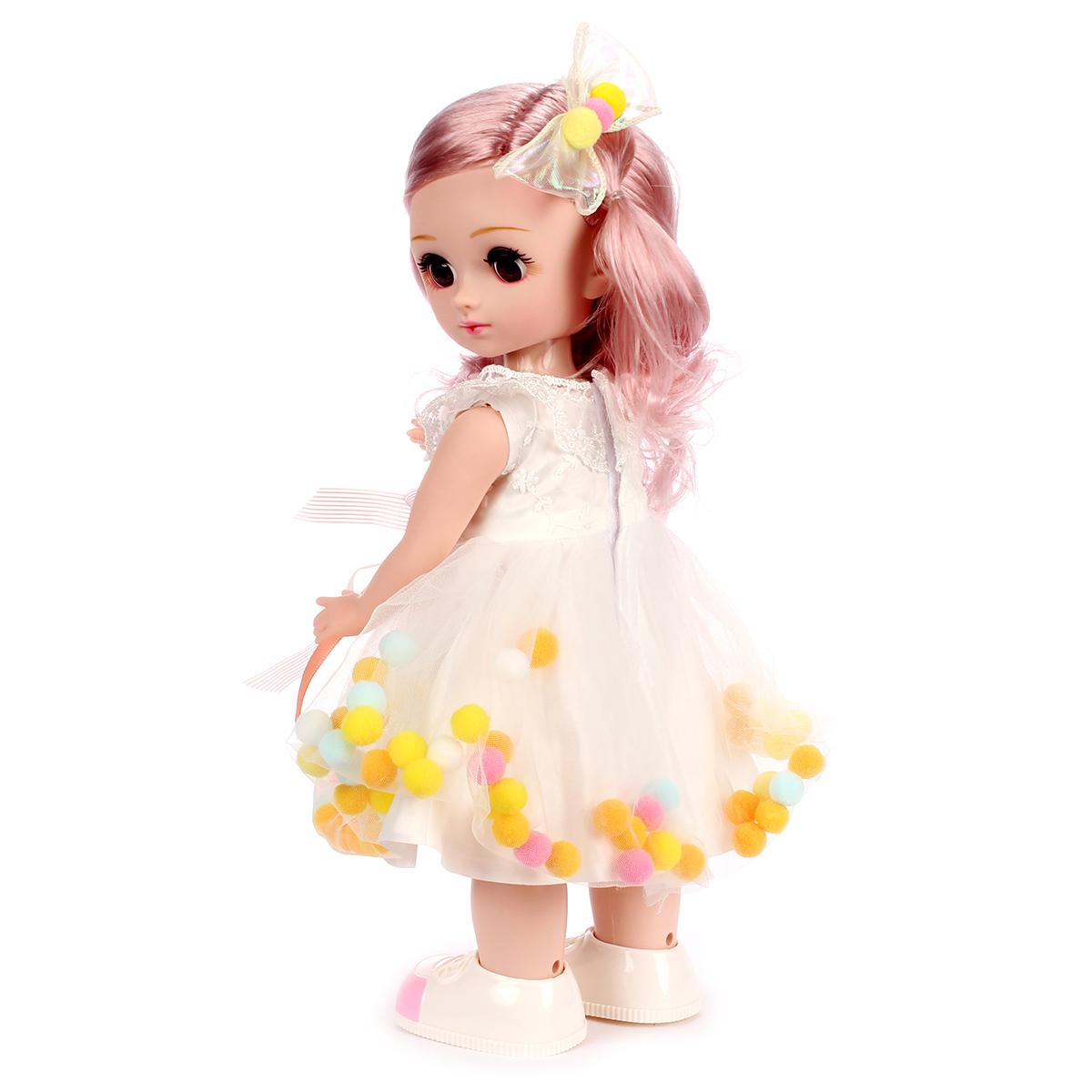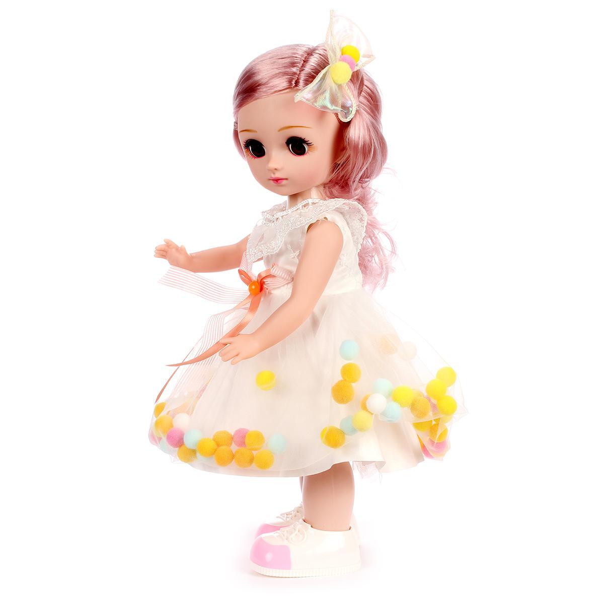Рост куклы составляет 38 см, что делает её удобной для игры. Она одета в красивое белое платье с яркими помпонами и имеет длинные розовые волосы, что придаёт ей привлекательный вид. Кукла может танцевать и петь, что делает её ещё более интересной для детей. Играйте и обучайтесь вместе с "Аленой" — это весело и полезно!