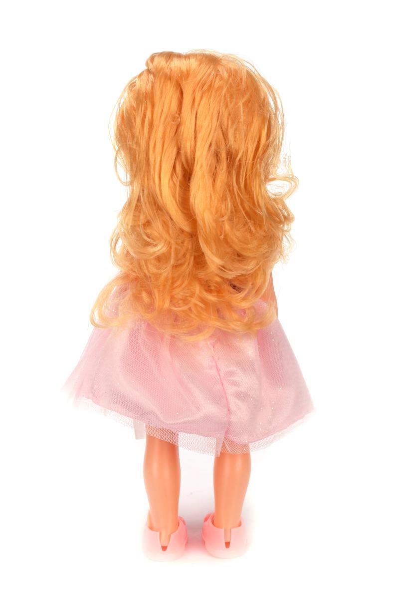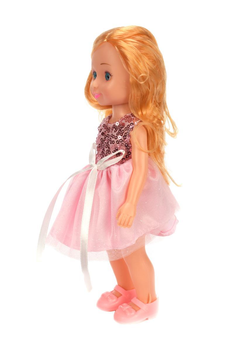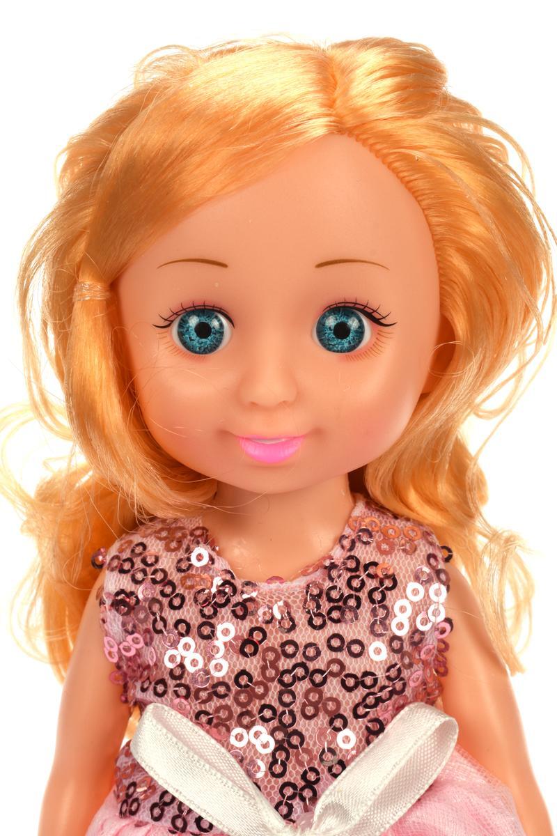 Кукла с выразительными голубыми глазами и улыбкой станет верным спутником вашего ребёнка. Мягкие завитки светлых волос и нарядное блестящее платье пробуждают интерес к творческим играм и заботе.