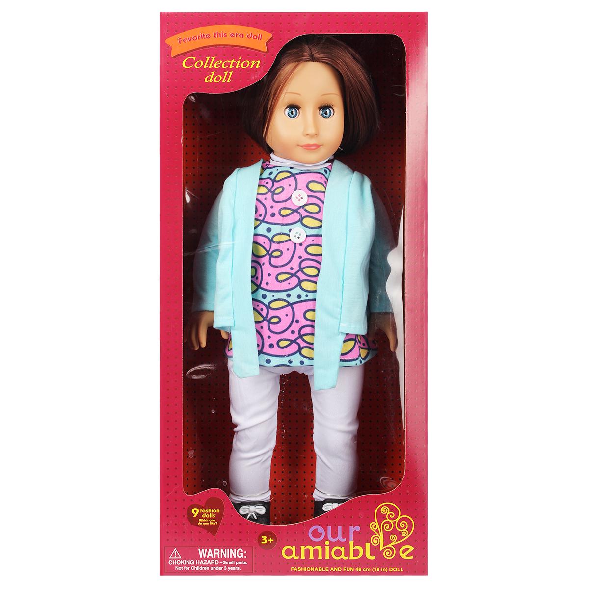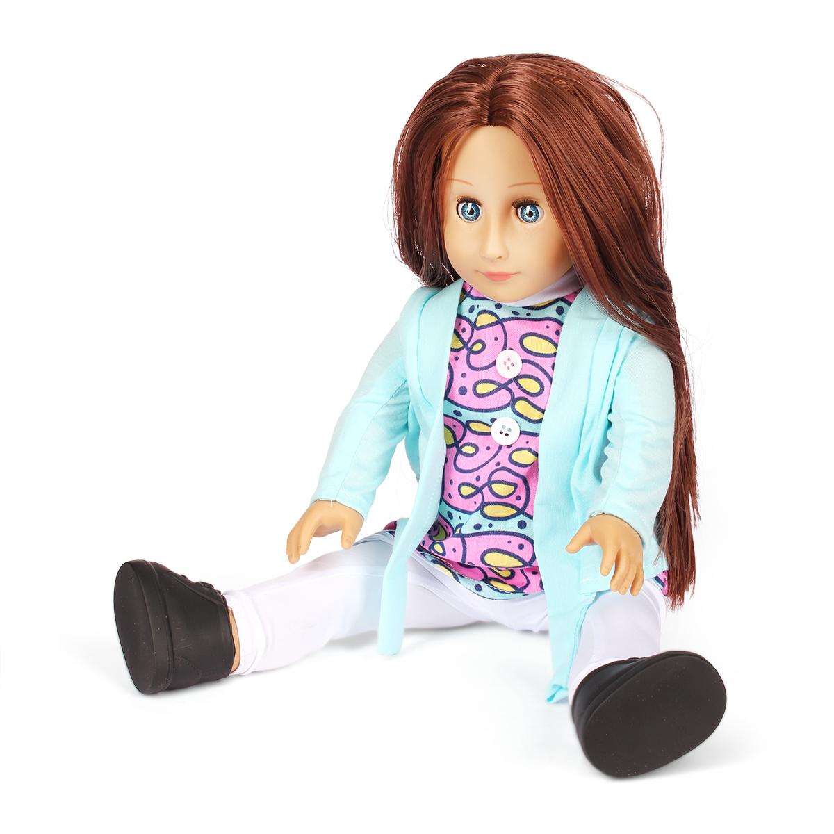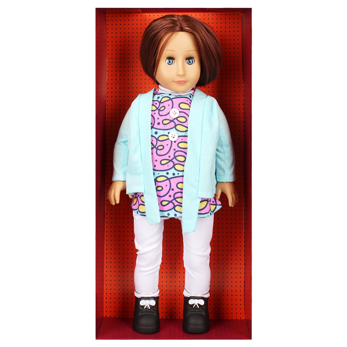 Эта кукла выделяется среди других благодаря своему качественному исполнению и яркому дизайну. Она одета в светло-голубую кофту и пестрое платье с рисунком, что делает её привлекательной для детей. Длинные каштановые волосы и большие голубые глаза придают ей особый шарм. Кукла также имеет белые леггинсы и черные туфли с бантиками, что добавляет ей стильности.