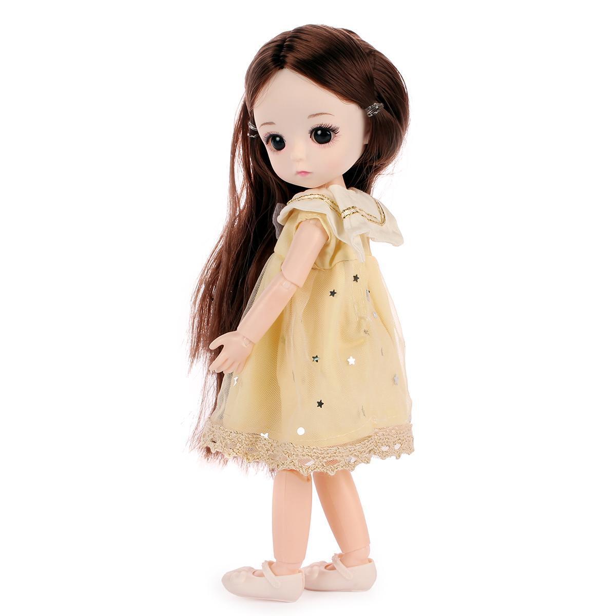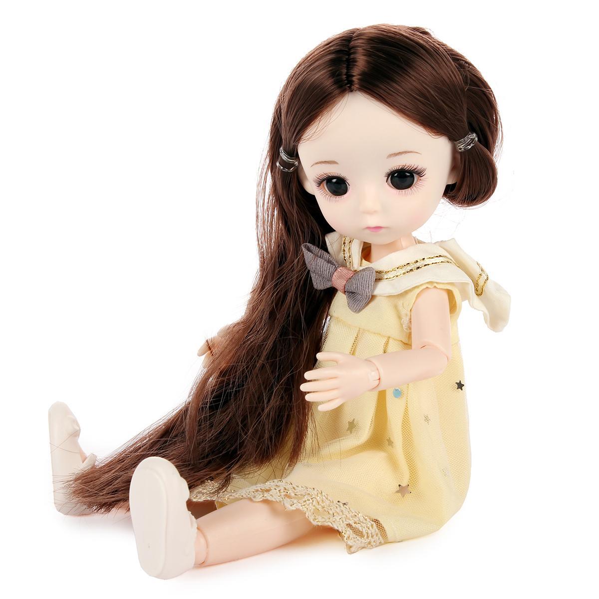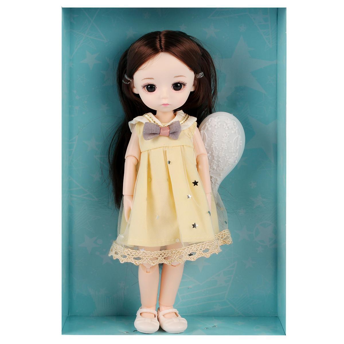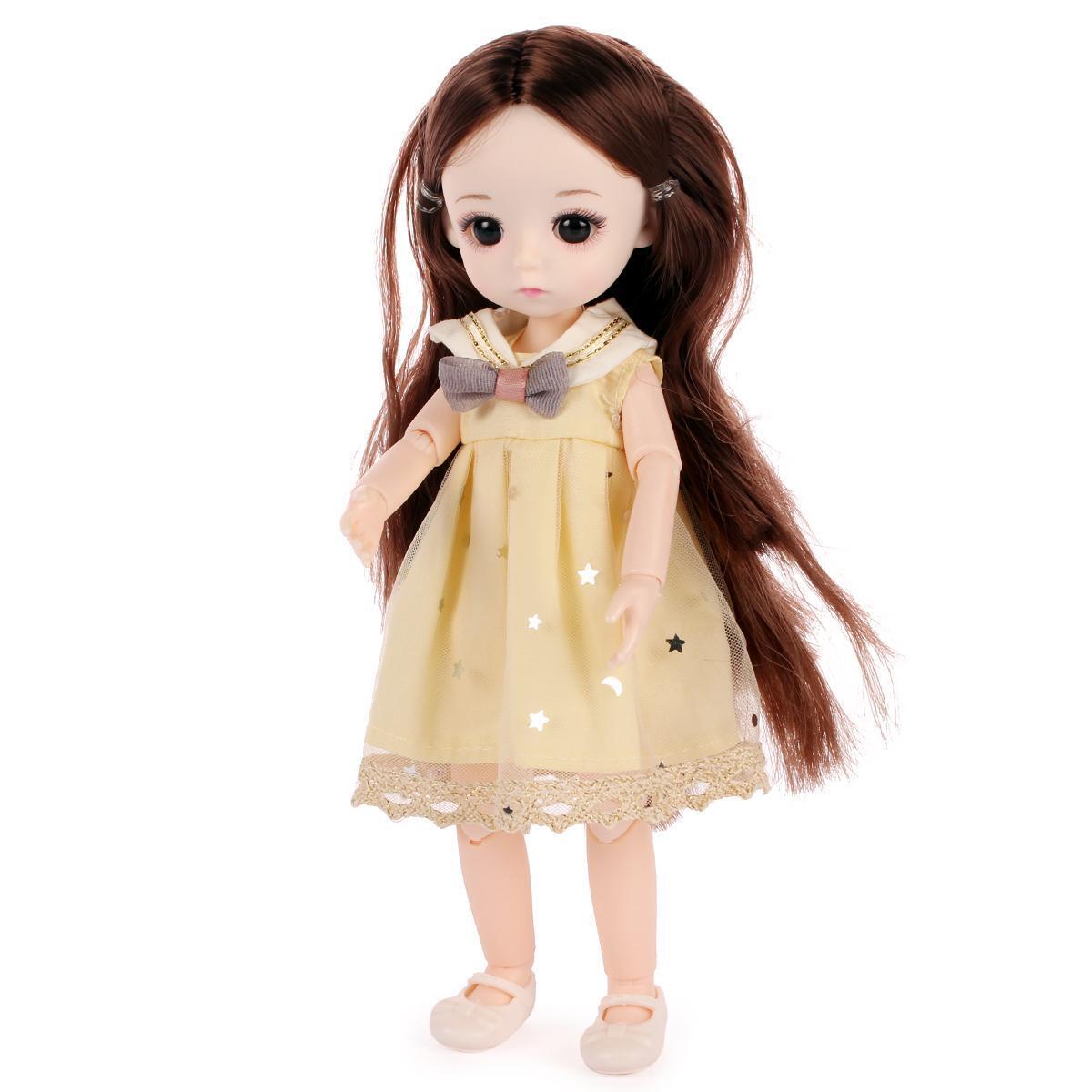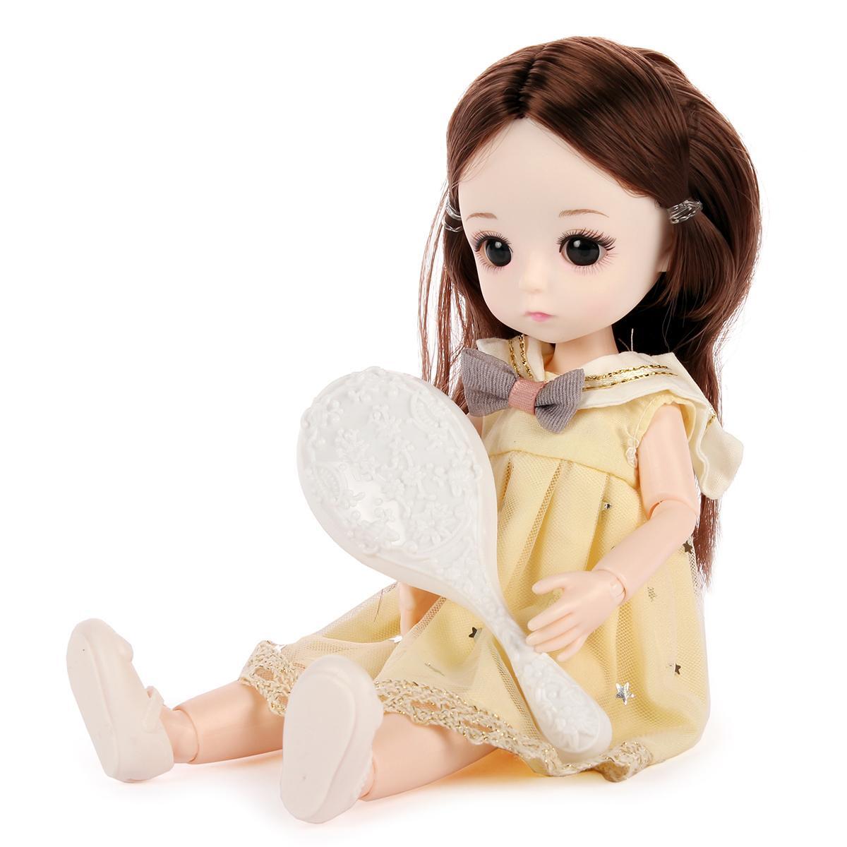 Рост куклы — 23 см (идеально для маленьких рук). Упаковка размером 17,3×6,5×26,5 см удобна для хранения аксессуаров. Жёлтое платье с серым бантом и кружевным подолом легко стирается. Подвижные суставы сохраняют фиксацию даже после активных игр.