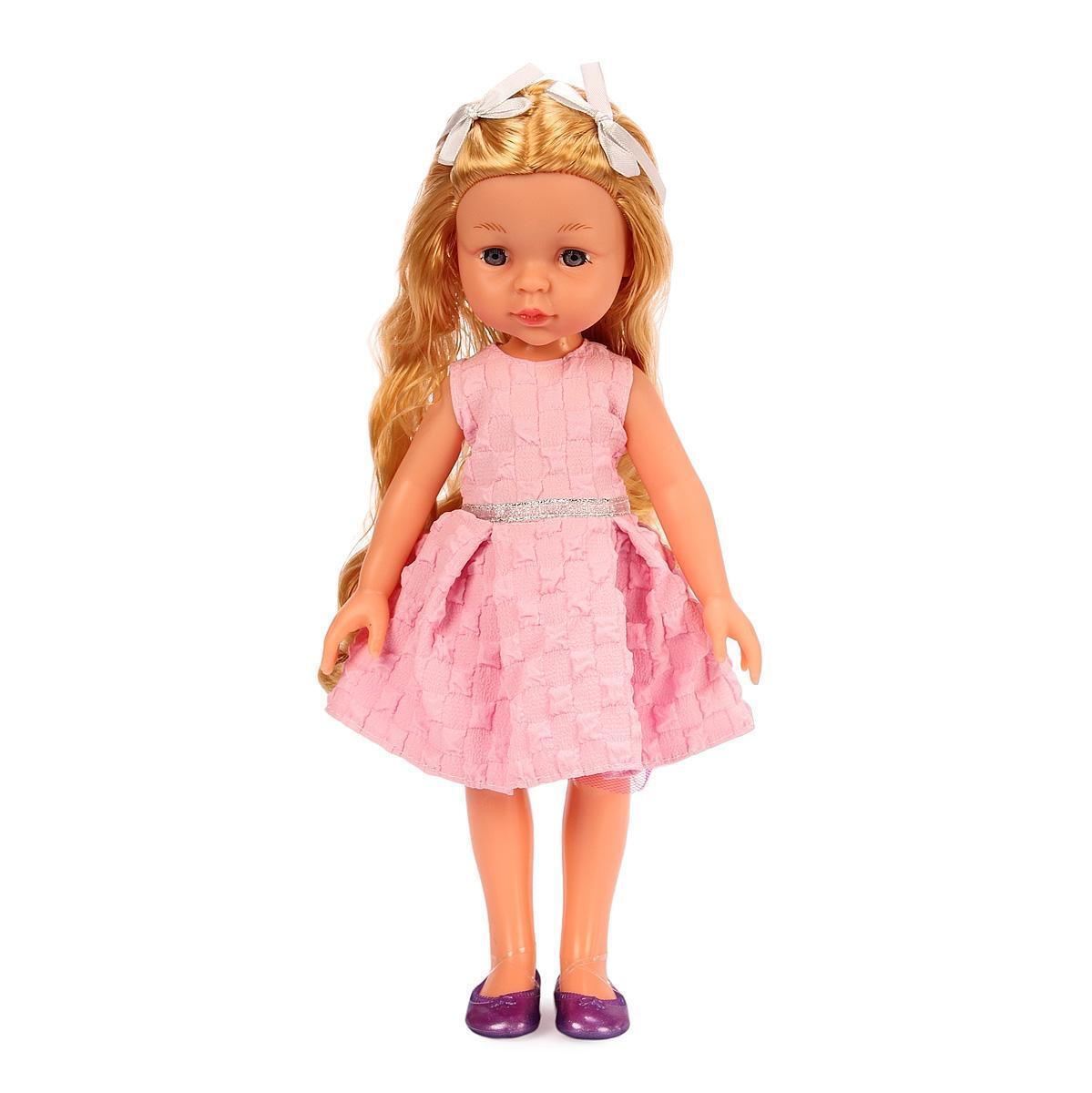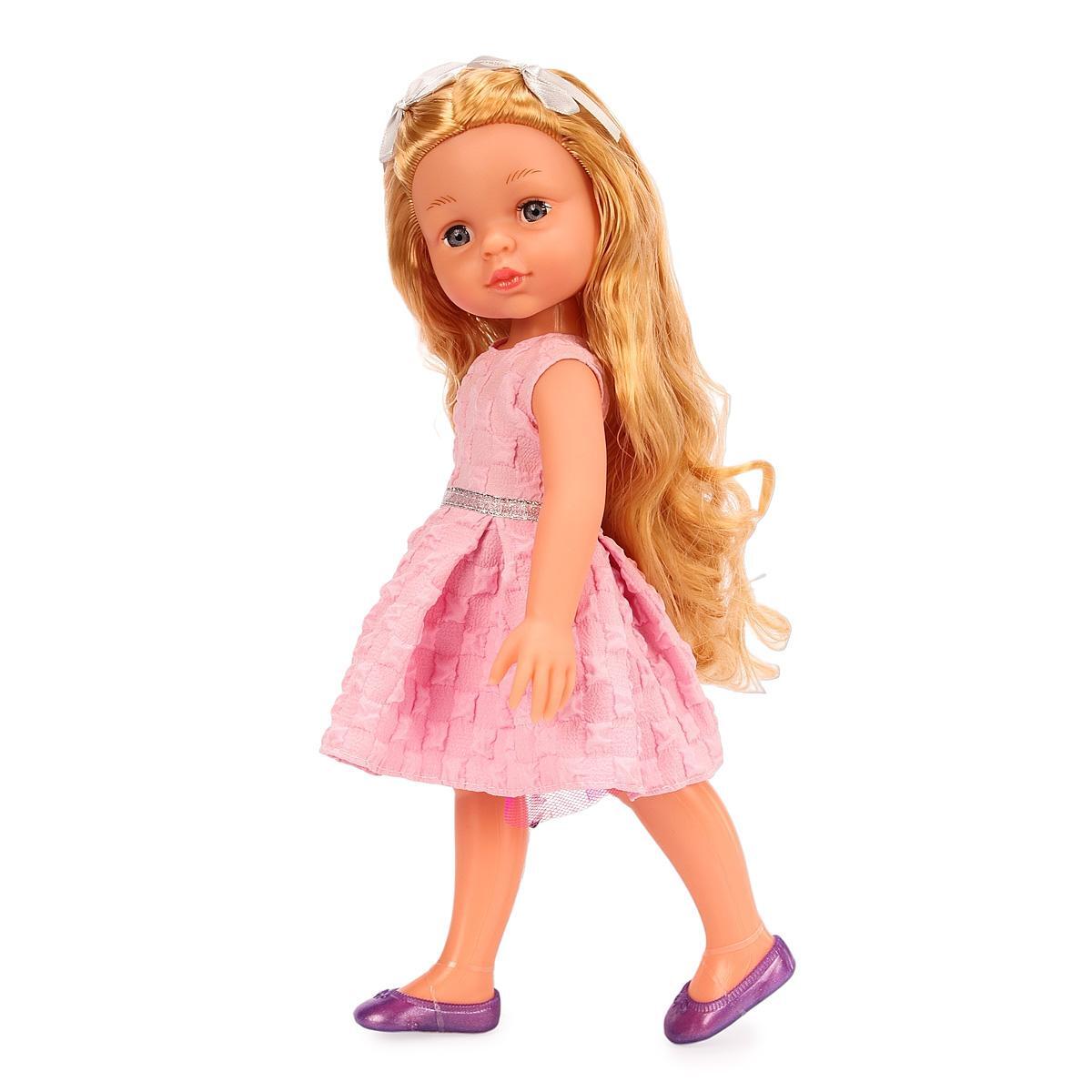Размер упаковки составляет 18х8х35,5 см, что делает ее удобной для хранения и транспортировки. Кукла одета в розовое платье с текстурированной поверхностью и серебристым поясом, а также фиолетовые туфли, что добавляет ей шарма. Длинные светлые волосы куклы можно расчесывать и укладывать, что также способствует развитию мелкой моторики у детей.