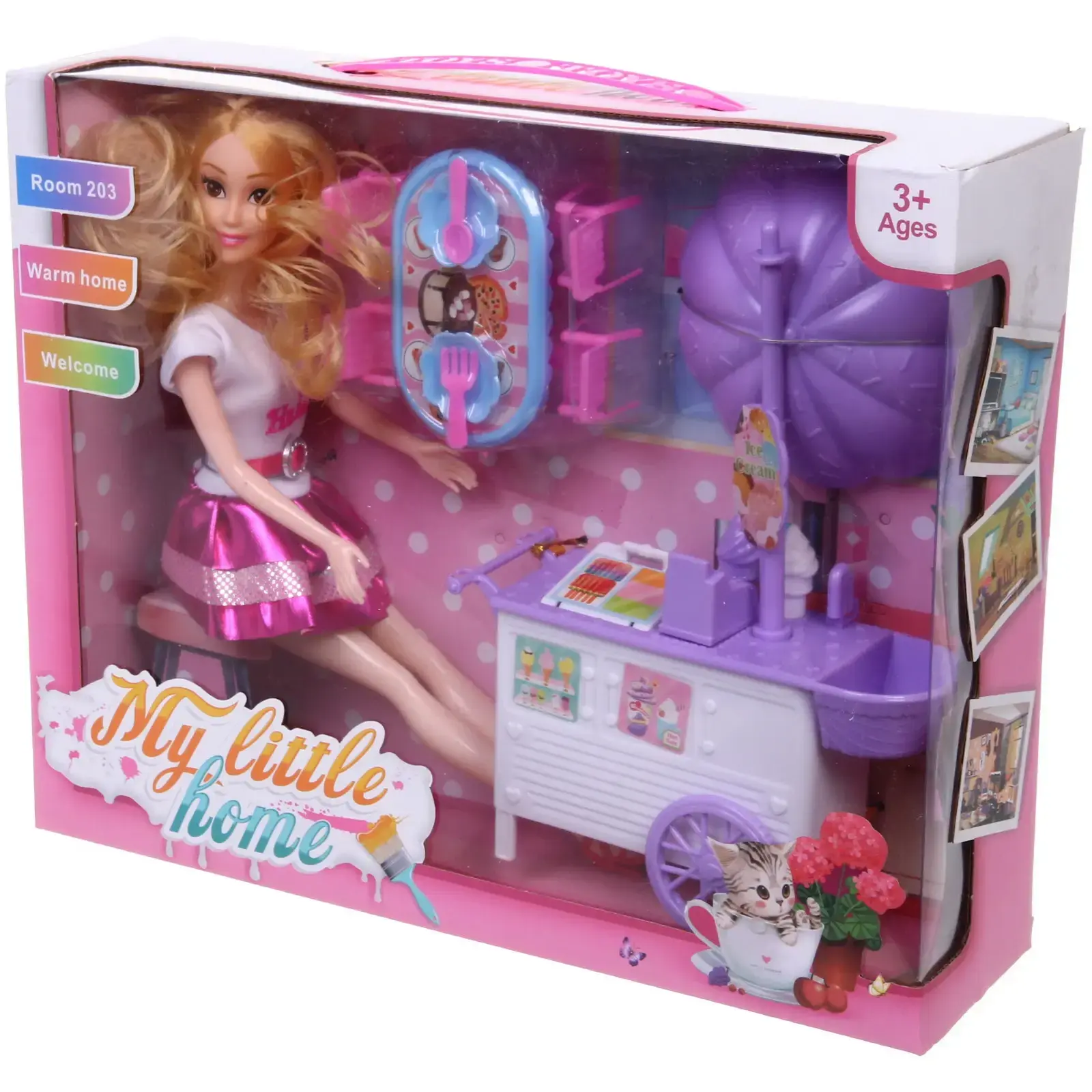Размер куклы составляет 30 см, а тележка для мороженого — 15 см в высоту и 10 см в ширину. Все элементы набора удобно упакованы, что позволяет легко хранить и переносить их. Упаковка оформлена в ярких цветах, что делает ее привлекательной для детей.