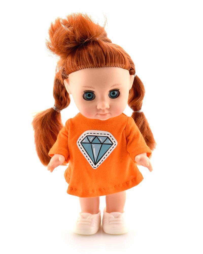 Материал: высококачественный пластик. Размер: 21 см. Цвет волос: светлый. Особенность: закрывающиеся глазки с пушистыми ресницами. Одежда: оранжевое платье с алмазиком и белые туфельки.
