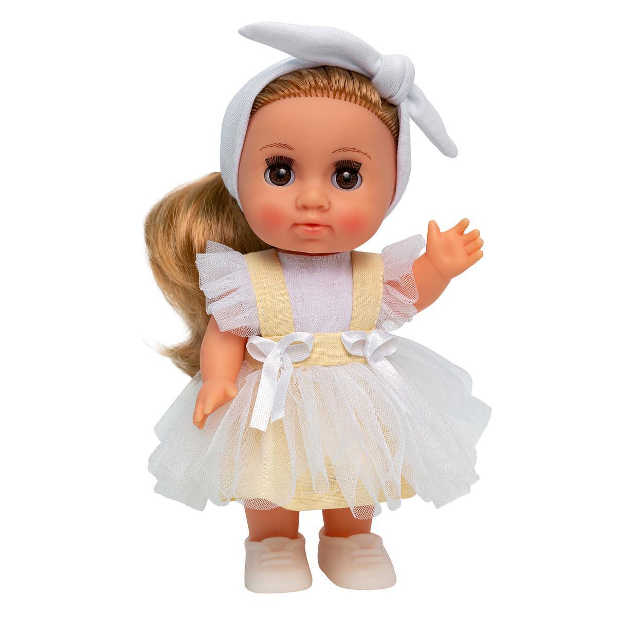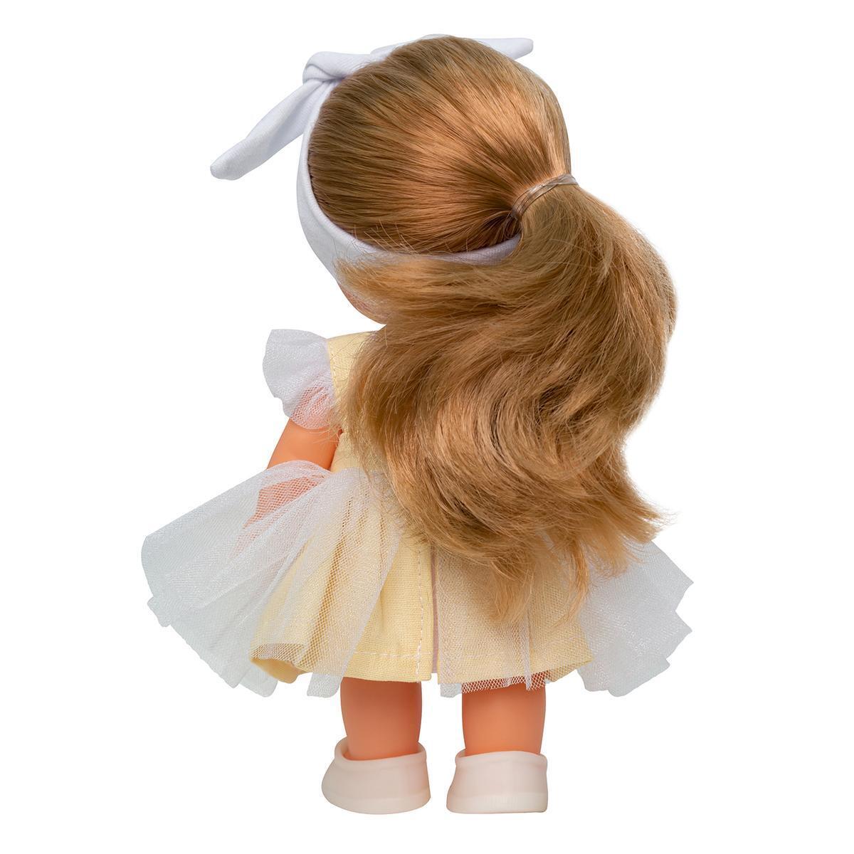 Кукла имеет подвижные ручки и ножки, что позволяет ей принимать различные позы. Мягкие волосы можно расчёсывать и завивать, а также переодевать в комплект одежды, который включает сарафан с декоративными бантиками, безрукавную футболку, повязку на голову и ботиночки. Кукла подходит для детей от 3 лет и станет отличным спутником в играх.