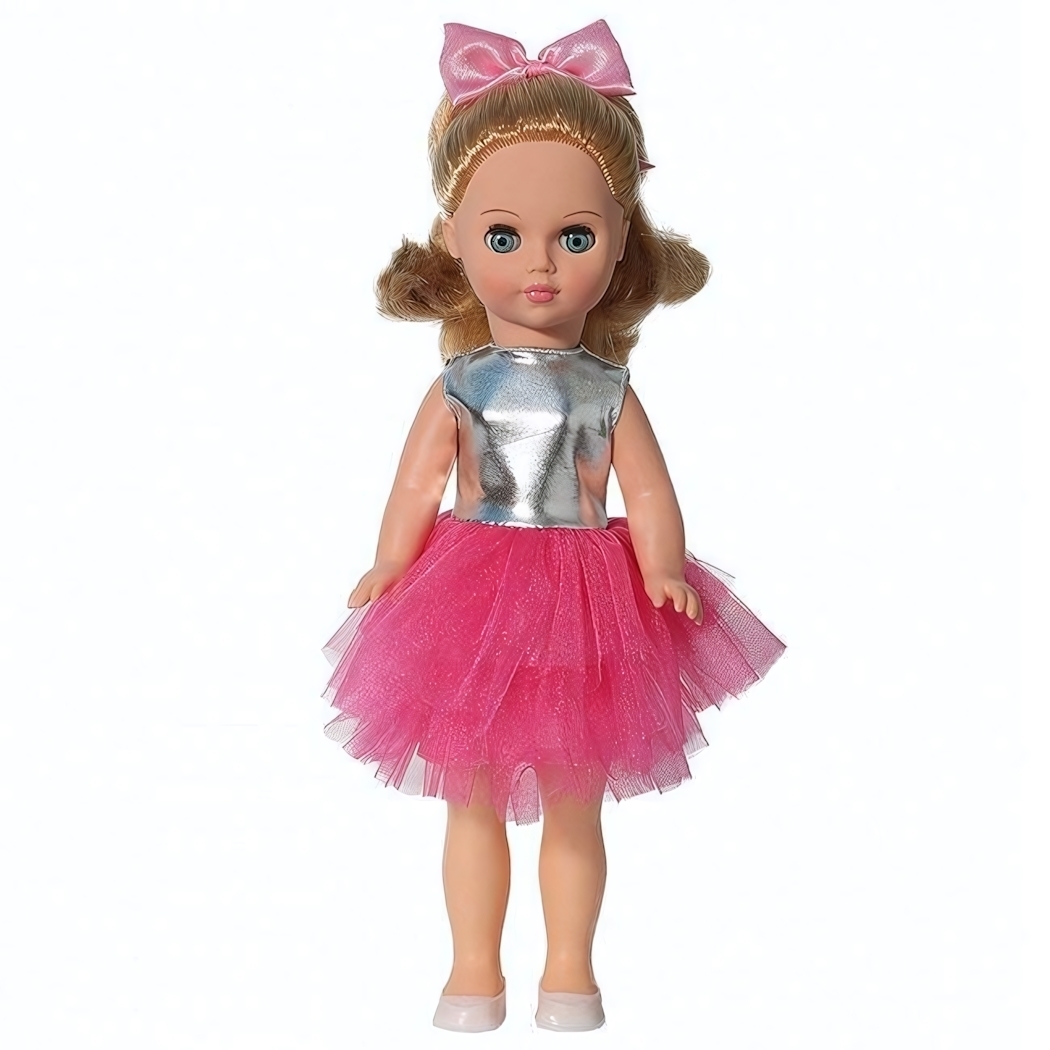 Кукла Мила имеет высоту 38,5 см, что делает её удобной для игры и хранения. Она одета в нарядное платье с серебристым верхом и розовой юбкой, а на голове украшена бантом. Белые туфельки завершают образ, придавая кукле элегантный вид. Эта кукла станет отличным подарком для любого праздника и порадует вашу девочку.