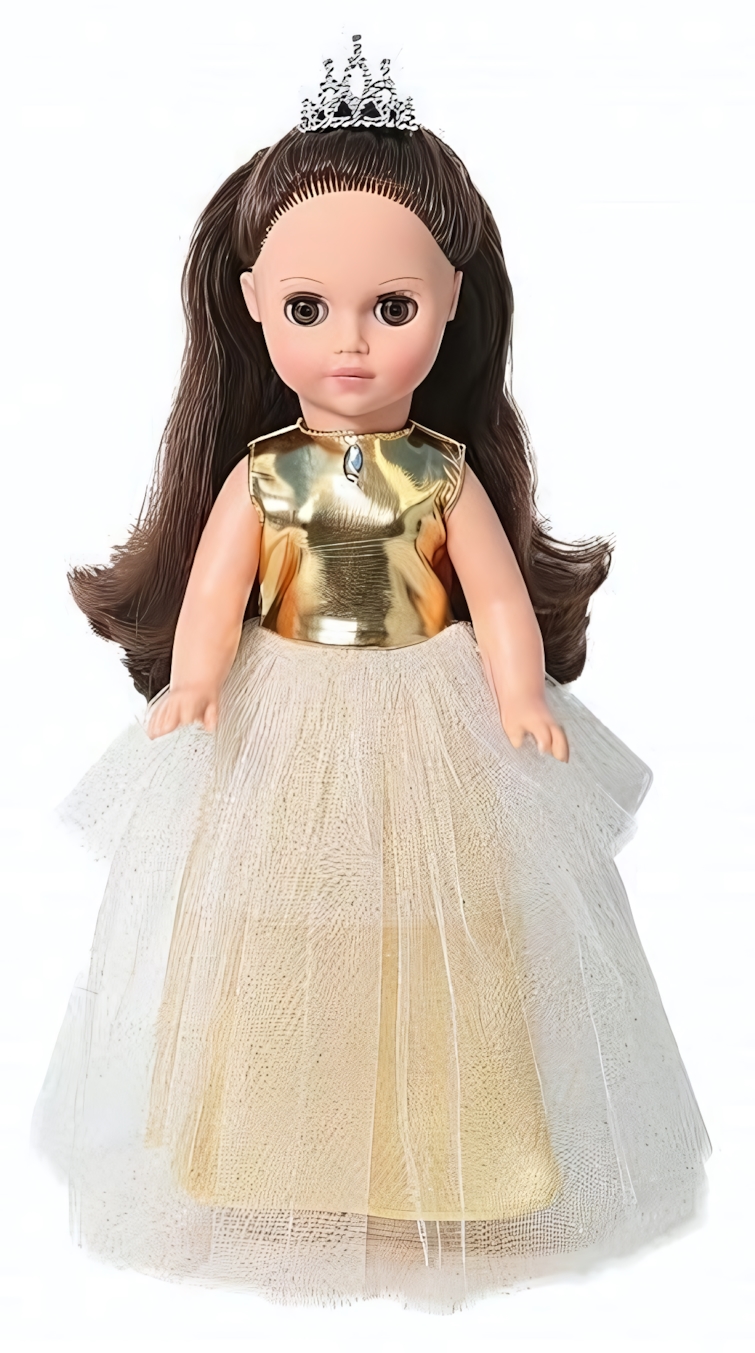 Кукла «Мила» в праздничном наряде станет верной подругой и источником радости для вашего ребёнка. Её роскошное платье с золотистым лифом и пышной тюлевой юбкой, изящная диадема и выразительные черты лица пробуждают фантазию и дарят незабываемые эмоции от игры.