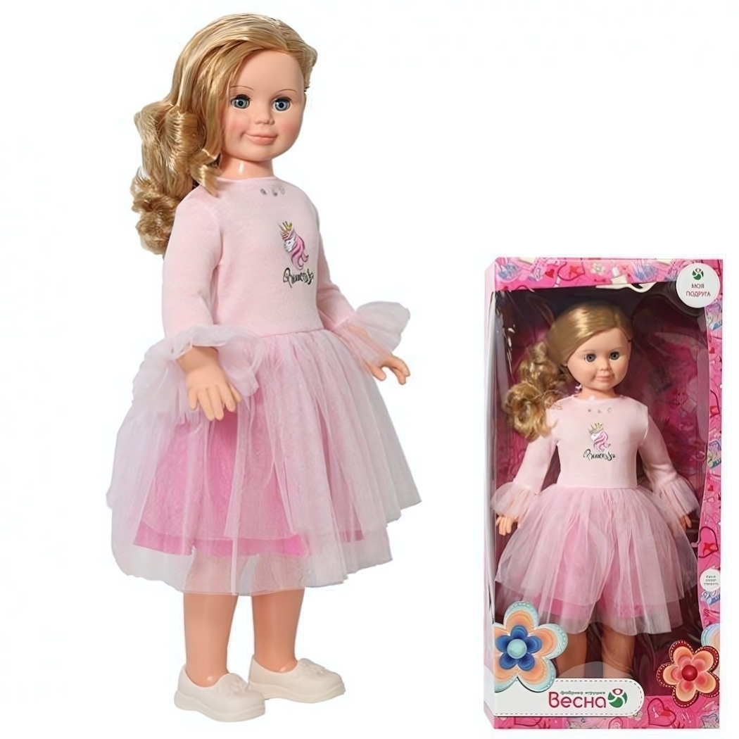 Кукла одета в утончённое розовое платье с пышной юбкой и рукавами с лёгкими прозрачными манжетами. Белые туфли завершают образ. Голова и ручки выполнены из мягкого и приятного на ощупь винила, тело и ножки – из прочного пластика.