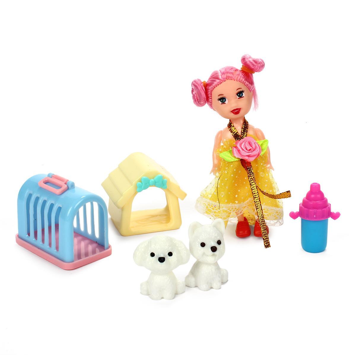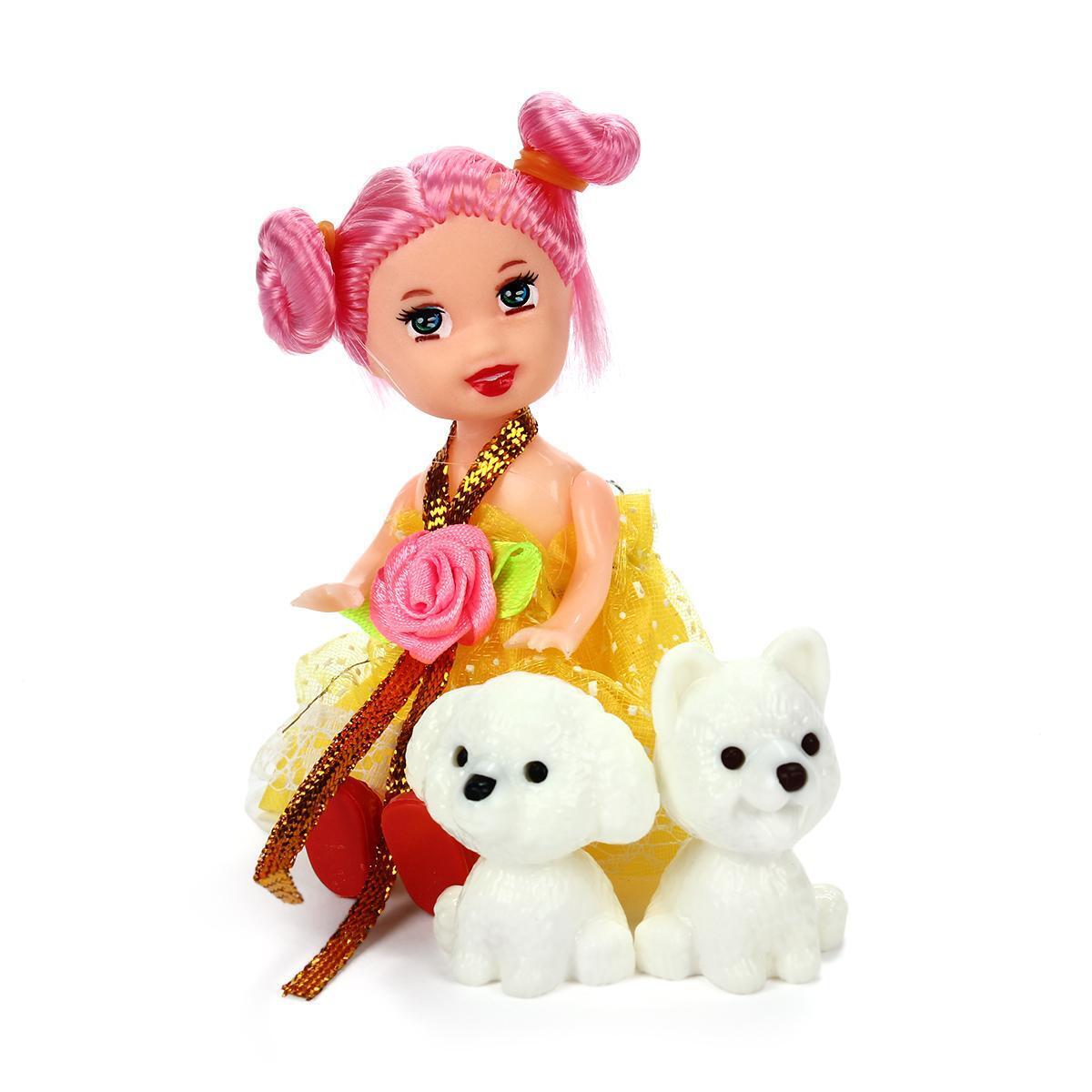 Эта кукла-мини с яркими аксессуарами станет настоящим другом для вашей девочки. С подвижными руками, ногами и головой, она позволяет создавать множество игровых сцен. Яркое желтое платье с узором и длинные розовые волосы делают куклу привлекательной и жизнерадостной. В комплект входят два милых щенка, домик для животных и переноска, что добавляет разнообразия в игру.