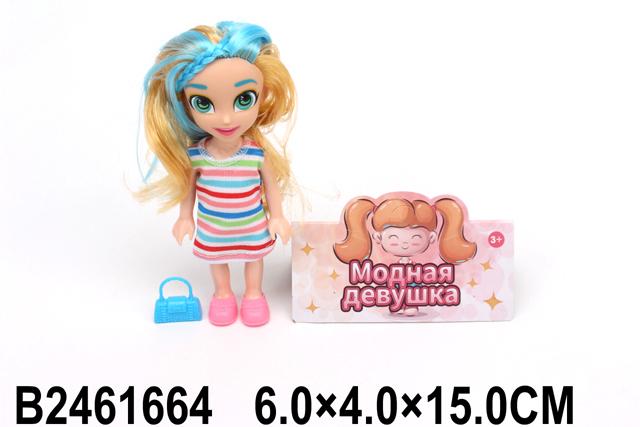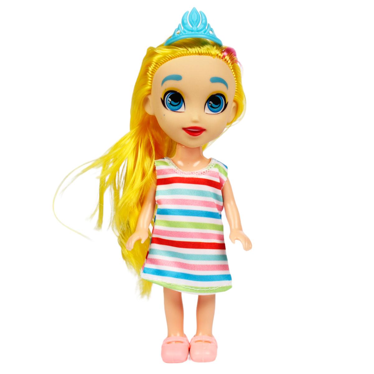 Эта мини-кукла размером 15 см украшена ярким платьем с горизонтальными полосками, дополнена стильными аксессуарами и сияющей голубой короной, что делает ее привлекательной и оригинальной игрушкой для девочки. Легкая и удобная в использовании, она станет любимой спутницей в играх и развивающих занятиях.