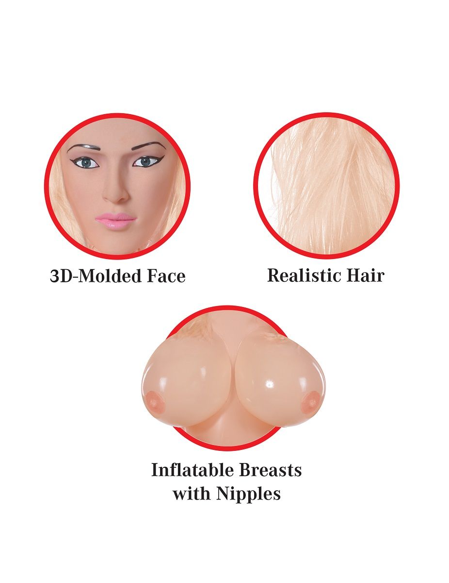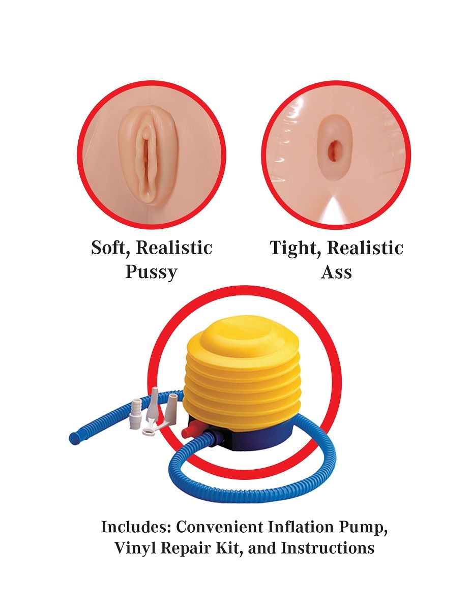 В комплект входит ручной насос для быстрого надувания, а также набор для ремонта винила и инструкция. После использования куклу можно сдуть для компактного хранения. Это удобно для тех, кто ценит приватность и экономию пространства.