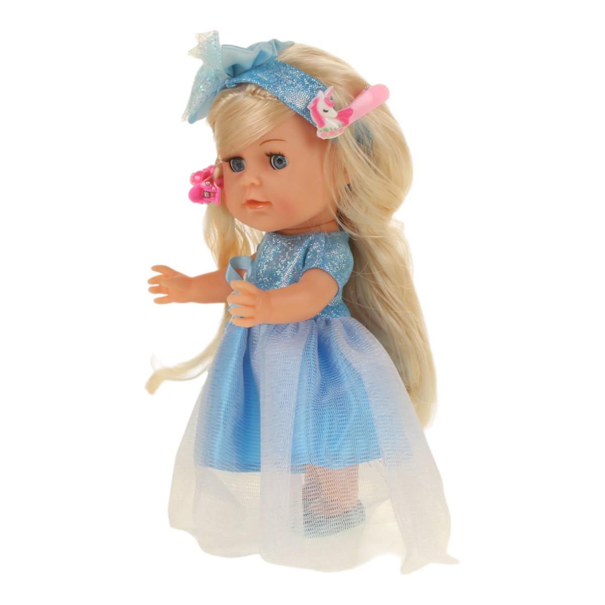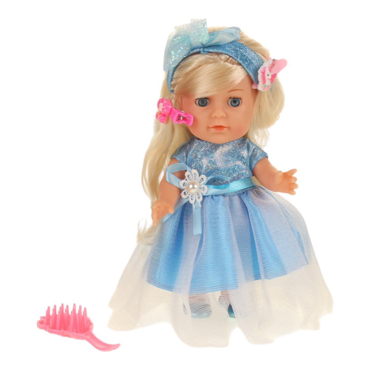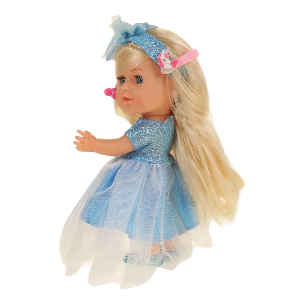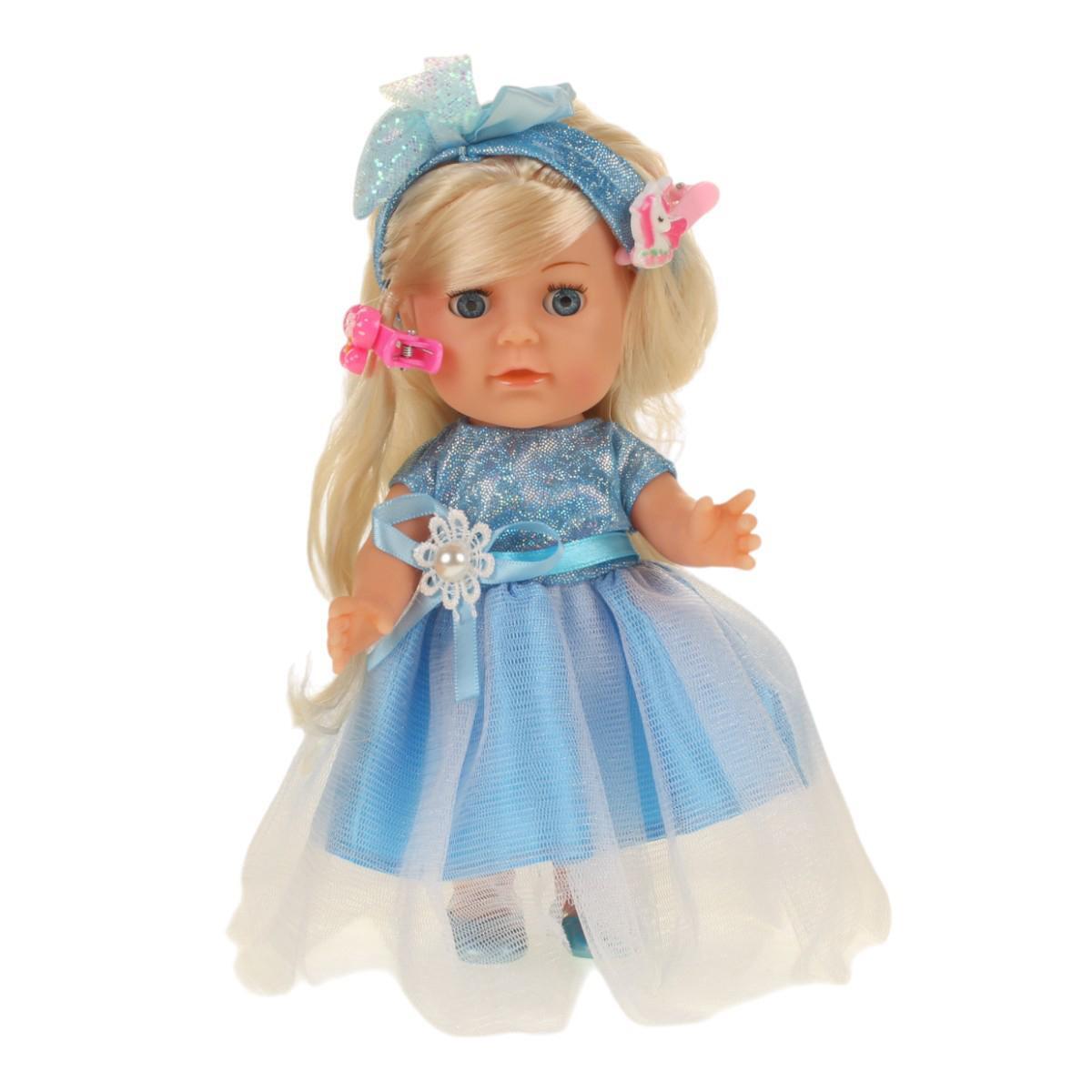 Рост куклы составляет 20 см, что делает её удобной для игры. Она работает от трех батареек типа LR44, которые входят в комплект. Одеяние куклы выполнено в нежных голубых тонах с блестящими элементами, что делает её особенно привлекательной для маленьких девочек.