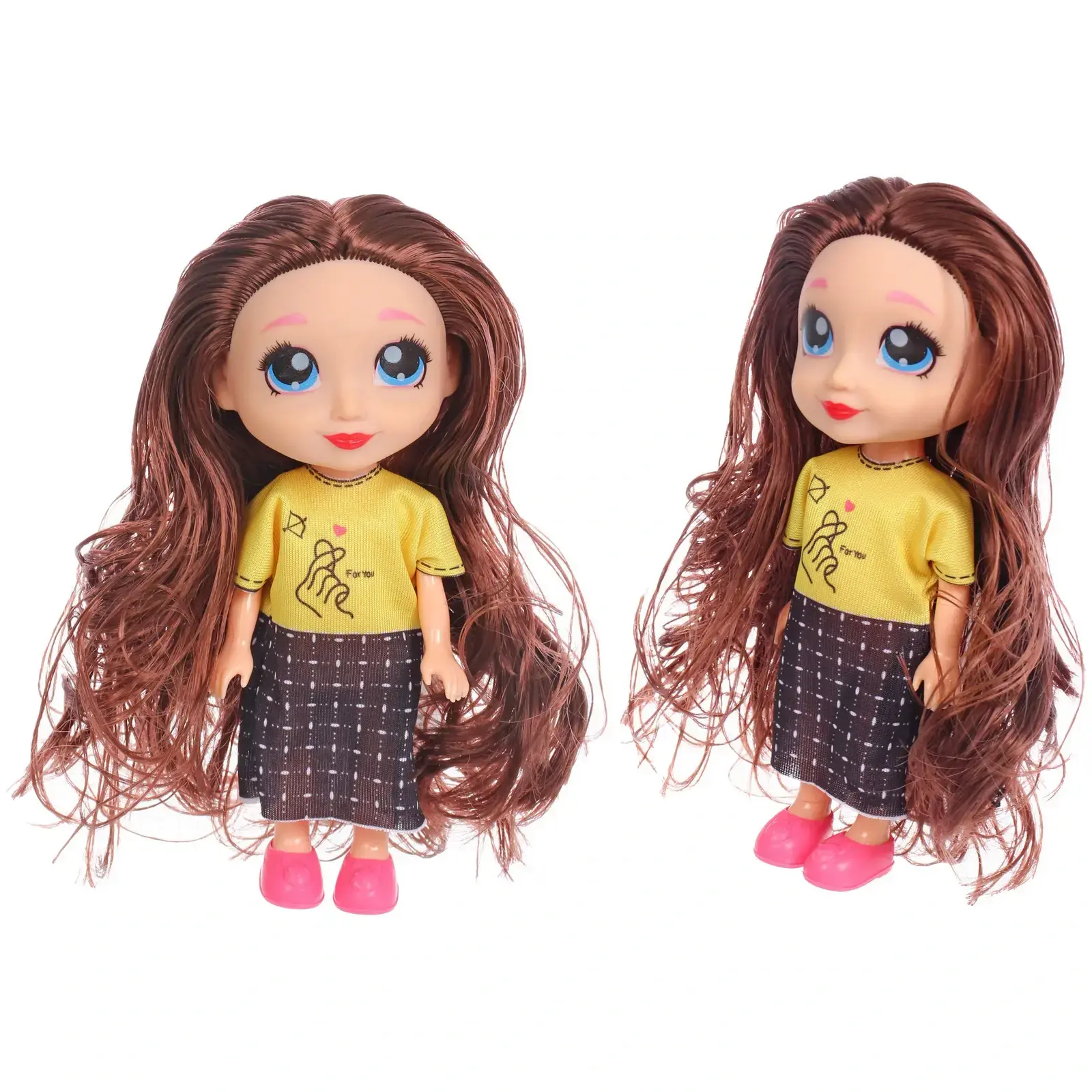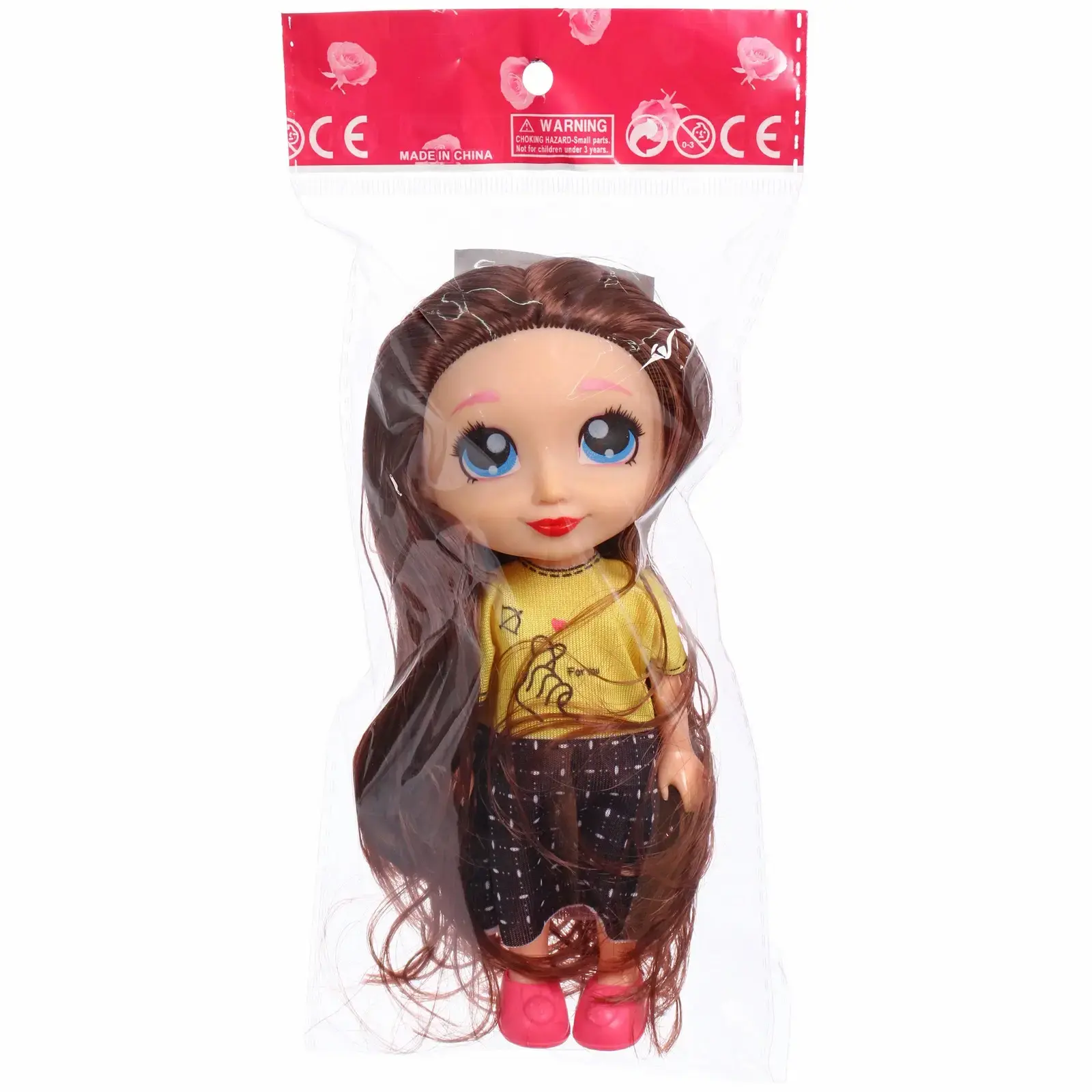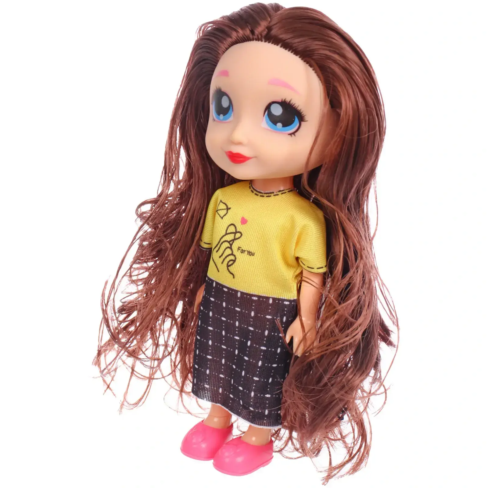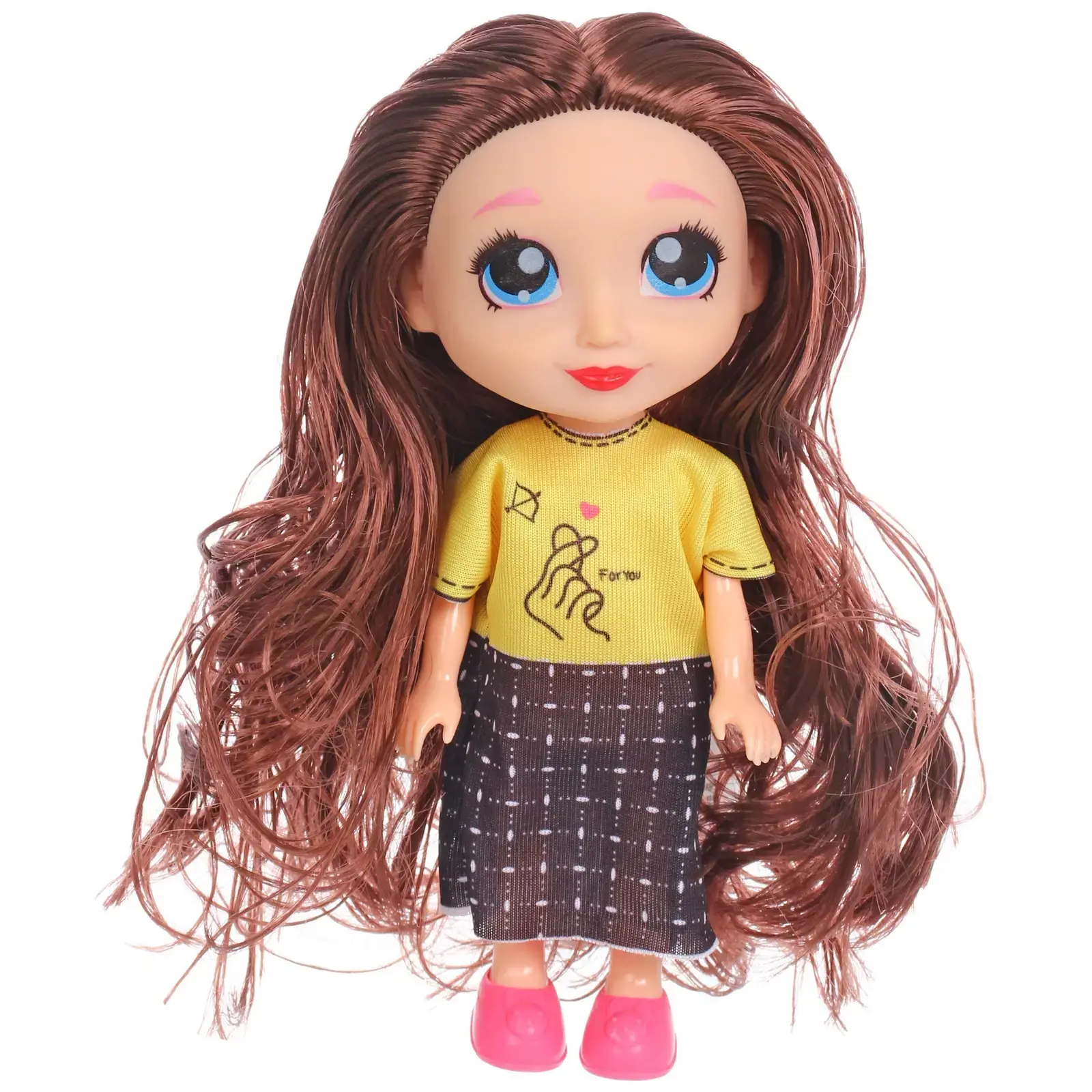 Высота игрушки составляет 15 см. Кукла одета в желтую футболку с принтом, черную юбку в клетку и розовые туфли. Голубые глаза и красные губы делают её образ особенно выразительным.