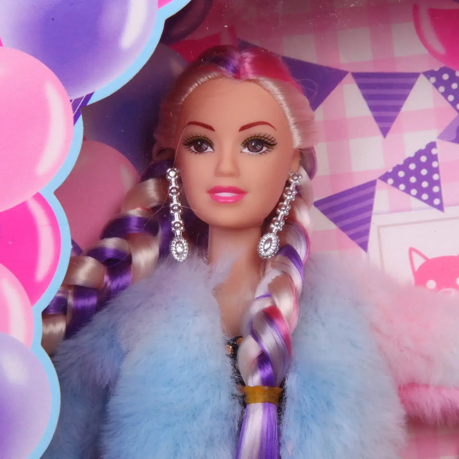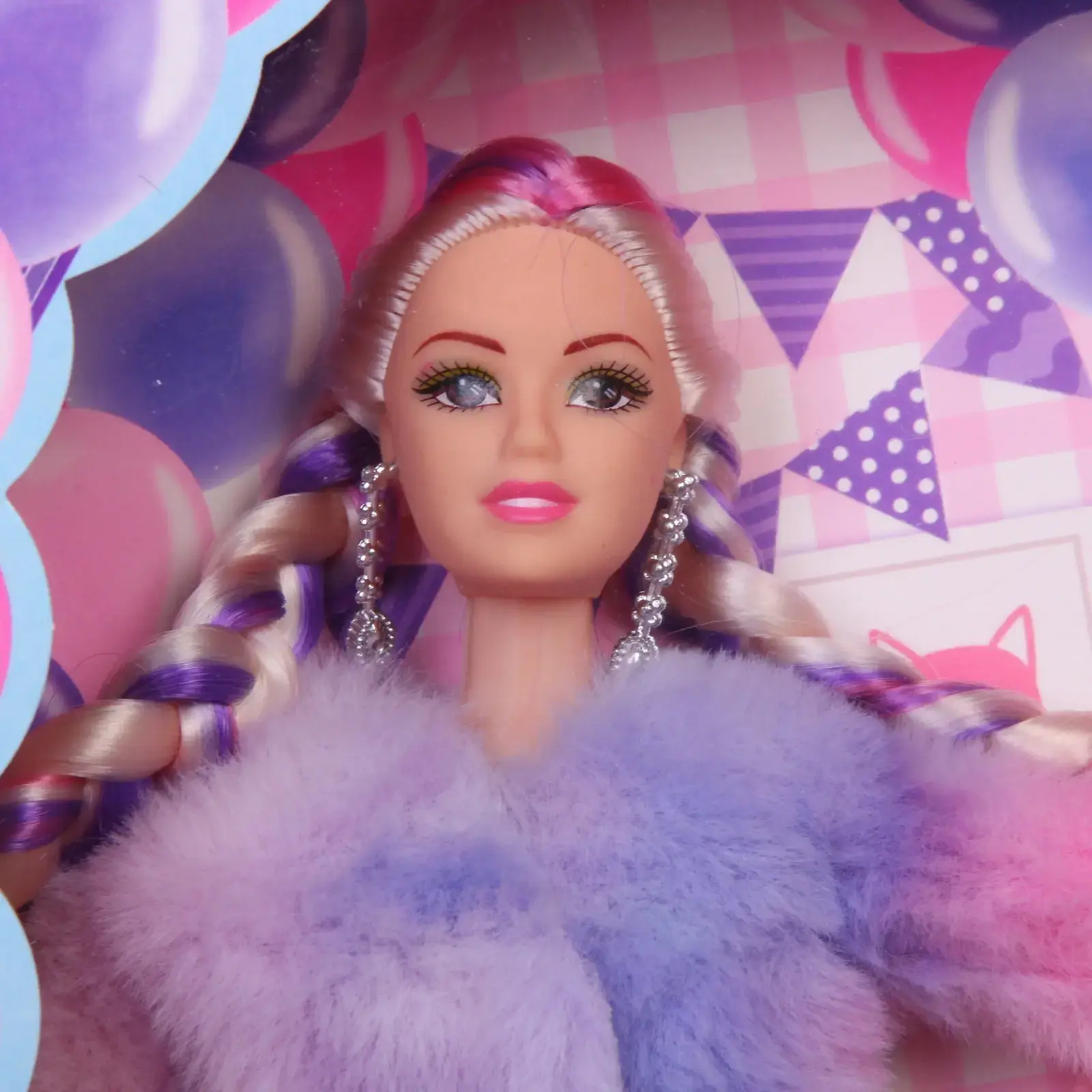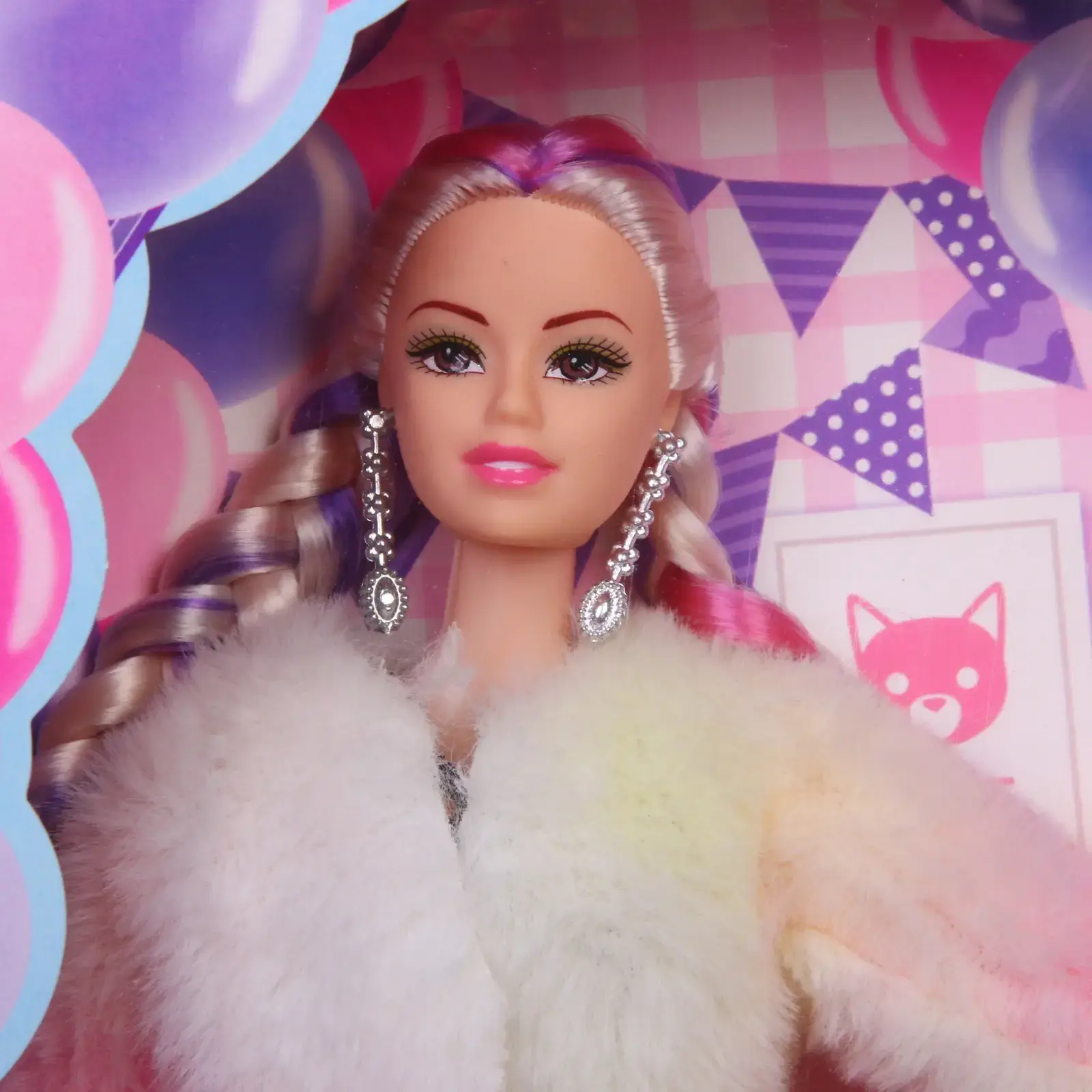 Размер куклы составляет 32,5 см, что делает её удобной для игры и хранения. Яркая одежда включает короткую юбку с белыми горошками и розовый меховой пиджак, что придаёт кукле уникальный стиль. Кукла имеет длинные светлые волосы с разноцветными прядями, которые можно укладывать по-разному, создавая новые образы.