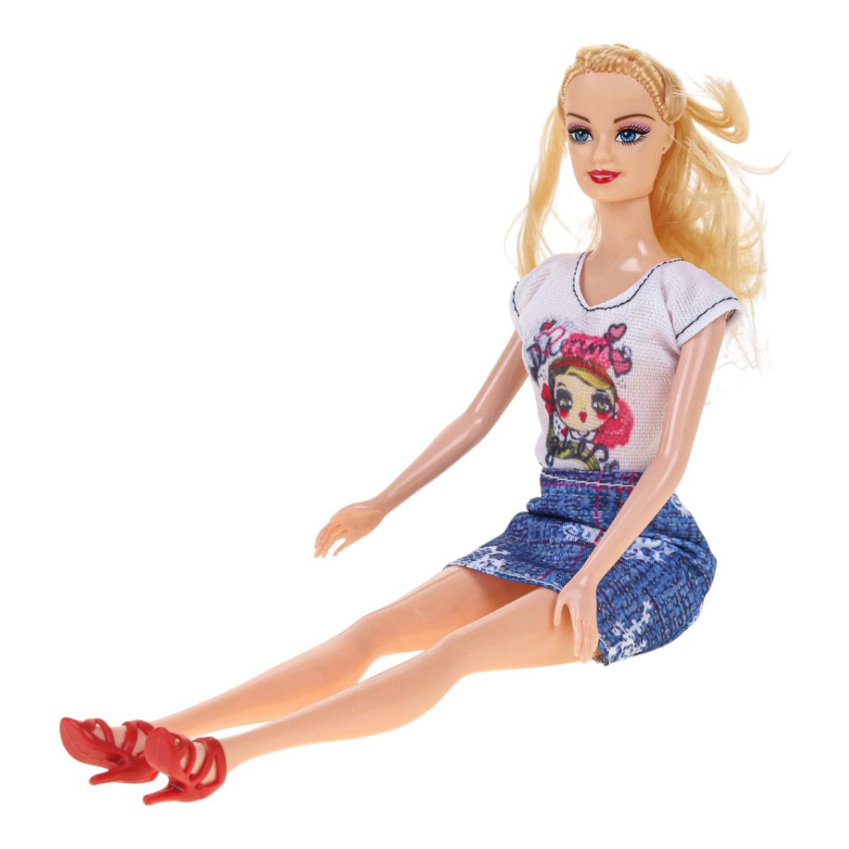 - Стильные наряды и аксессуары: Кукла одета в модную одежду повседневного стиля — платья, футболки, юбки с яркими принтами. Одежду и аксессуары легко снимать и надевать, что развивает мелкую моторику и чувство стиля.