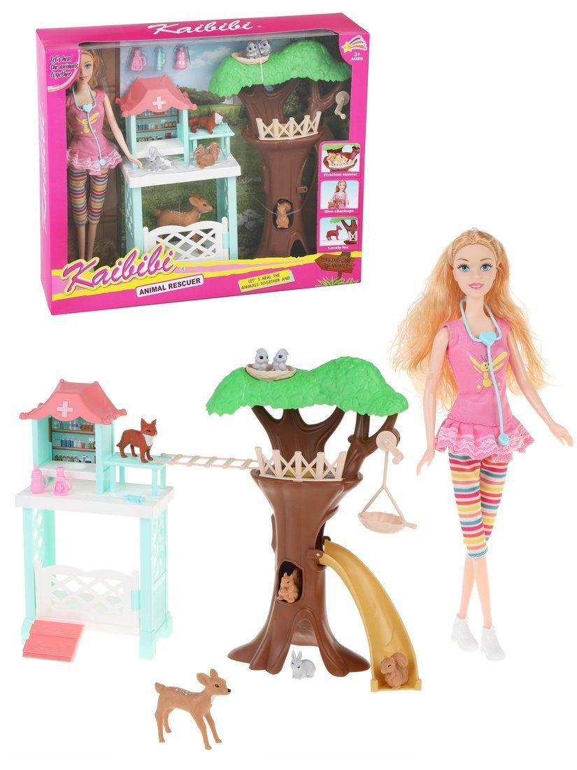 Кукла выполнена из безопасных материалов, что гарантирует её долговечность и безопасность для детей. Игровая площадка включает в себя элементы, такие как дерево с зелеными листьями и красной крышей, что создает атмосферу ветеринарной клиники. Размеры и детали игрушек тщательно продуманы, чтобы обеспечить максимальное удовольствие от игры.