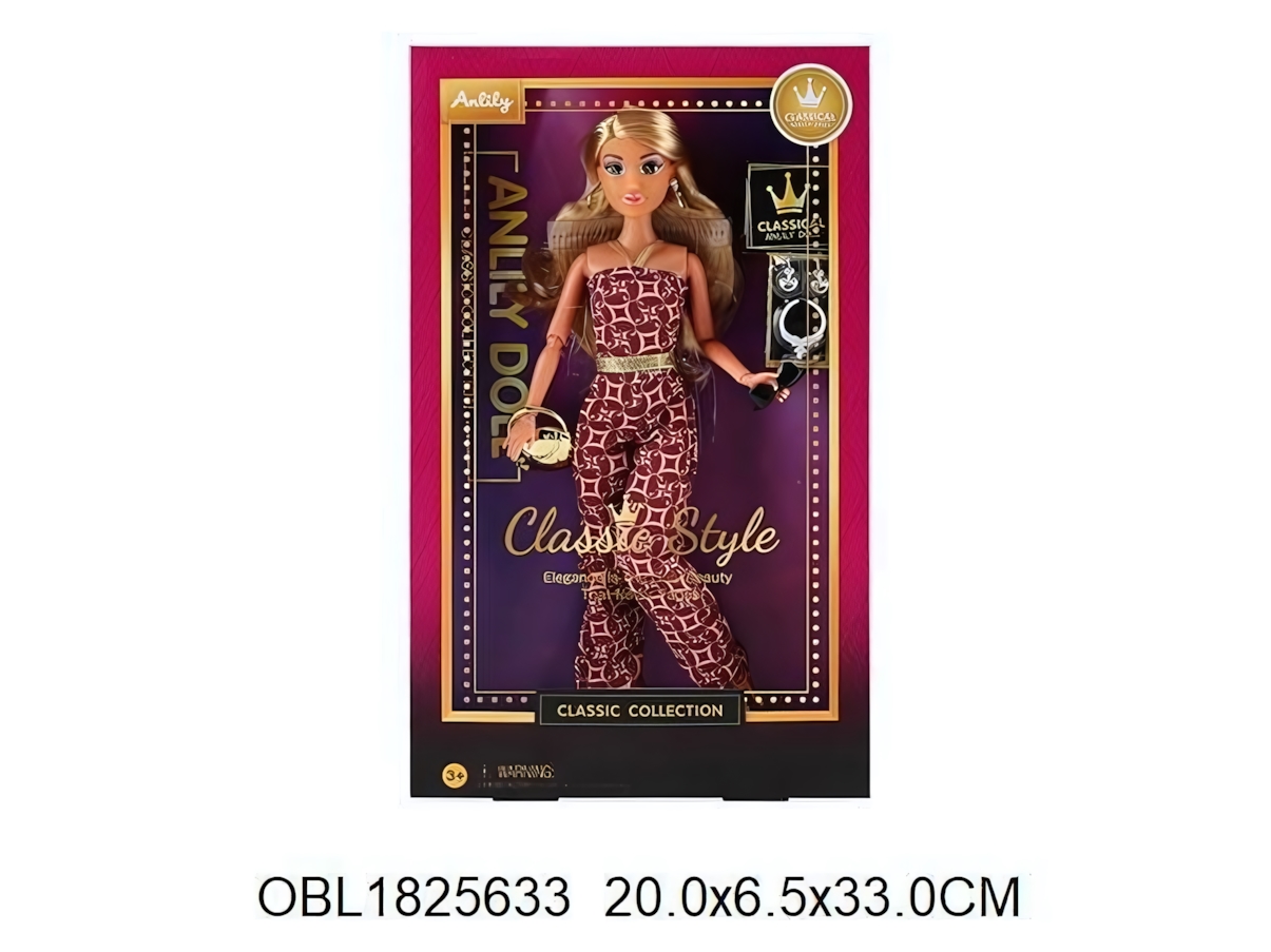Коробка 20х6,5х33 см удобна для хранения: вся мелкая бижутерия остаётся внутри, не теряется. Тёмно-фиолетовая упаковка с золотым принтом сразу говорит: «Это подарок!» — не нужно дополнительно упаковывать. Кукла безопасна: краски и пластик сертифицированы для детского возраста, нет острых углов.