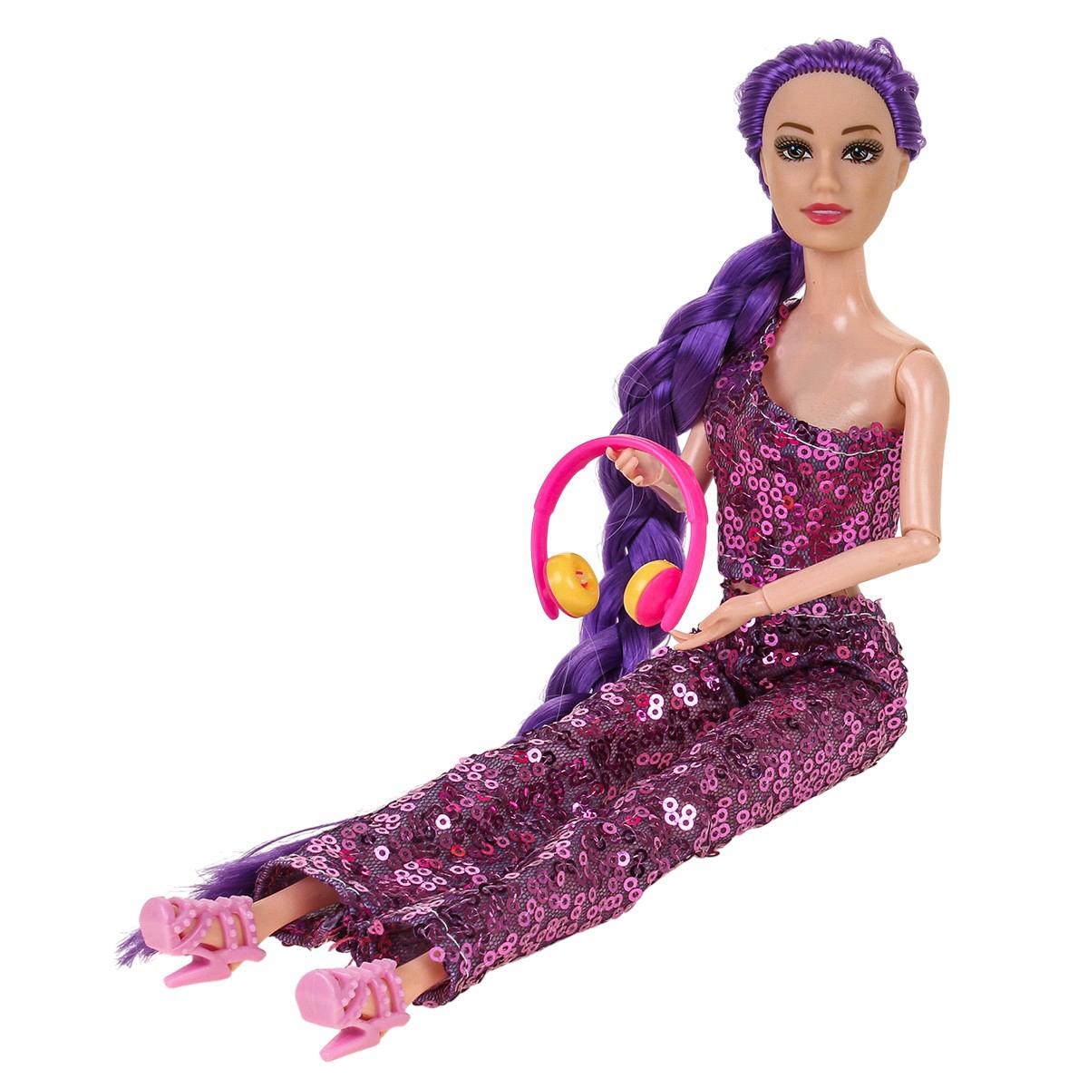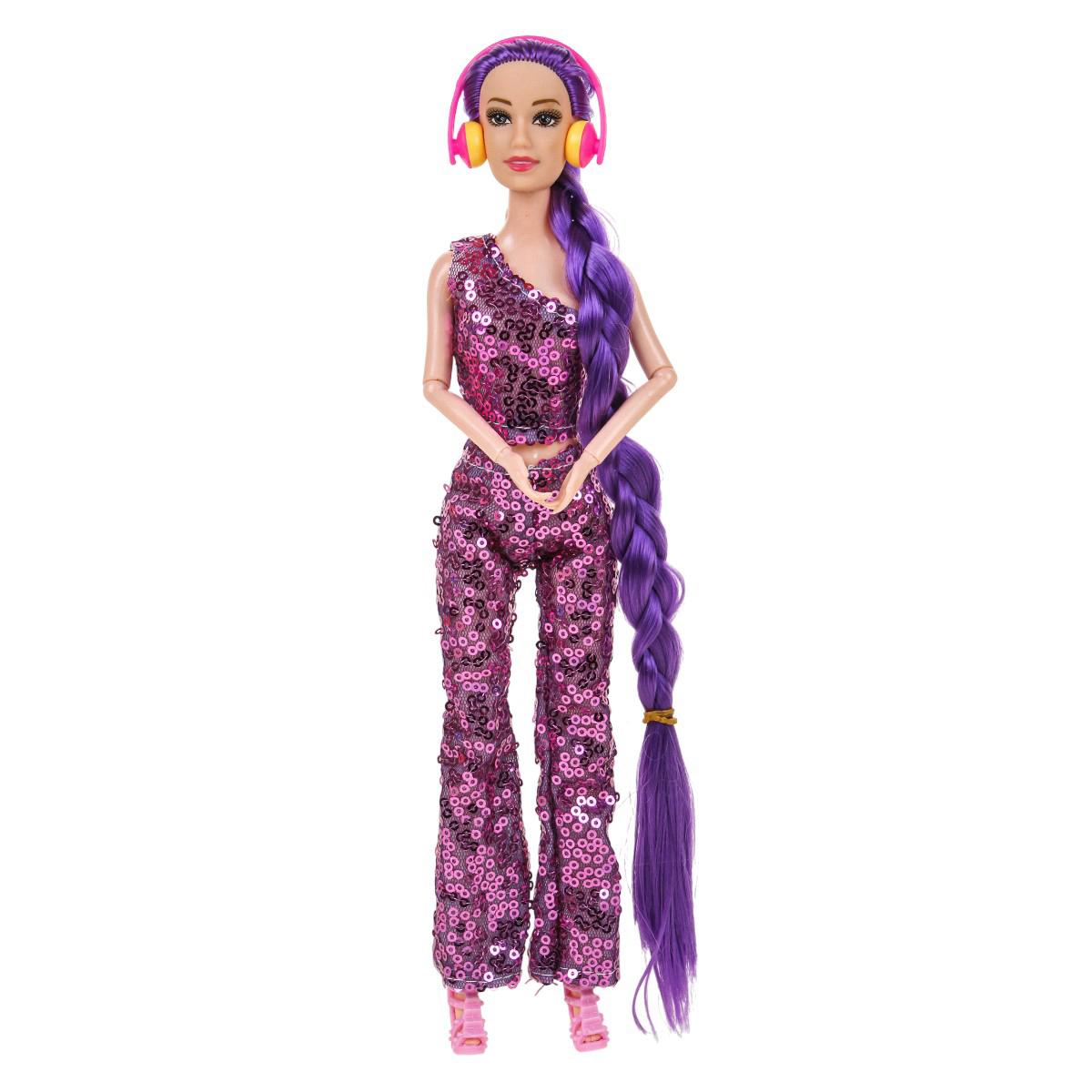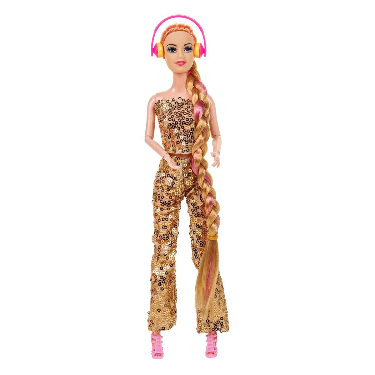 - Стильный дизайн и аксессуары: Кукла одета в модный блестящий костюм и имеет длинные волосы, заплетённые в косу. В комплектации могут присутствовать дополнительные аксессуары, например, наушники, что делает игру ещё интереснее.