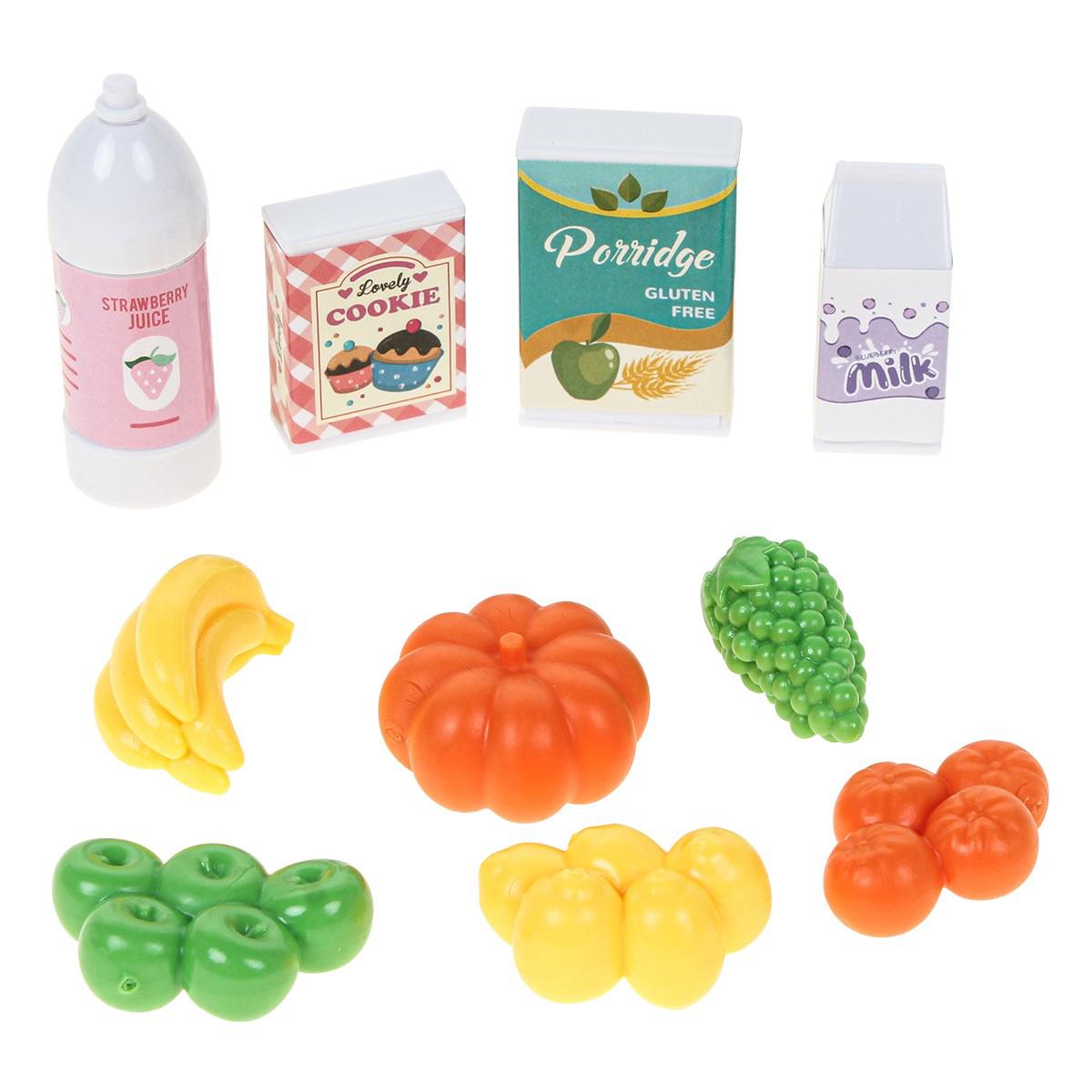 - Игрушечные продукты: Набор включает разнообразные фрукты и упакованные продукты, делая игру максимально похожей на реальную.