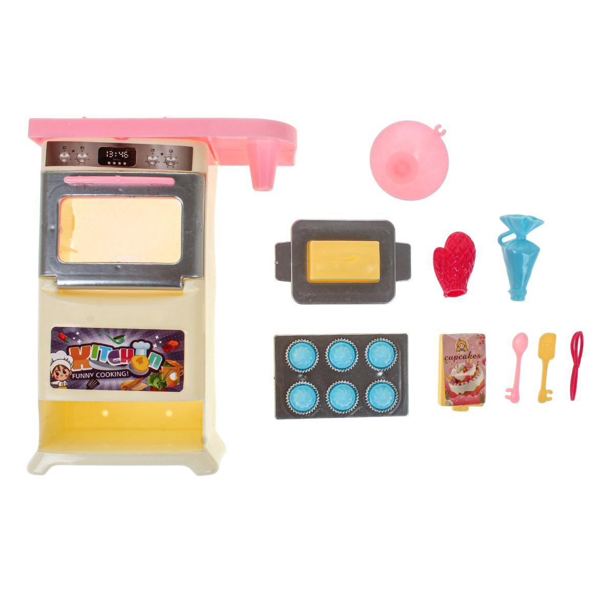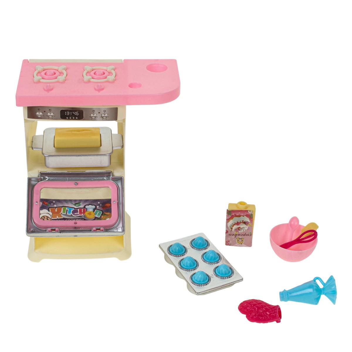 - Набор аксессуаров для игры: серебристый противень с шестью голубыми элементами выпечки, коробка "cupcakes", розовая миска, кондитерский мешок, кухонная варежка и несколько маленьких кухонных инструментов (ложка, венчик).