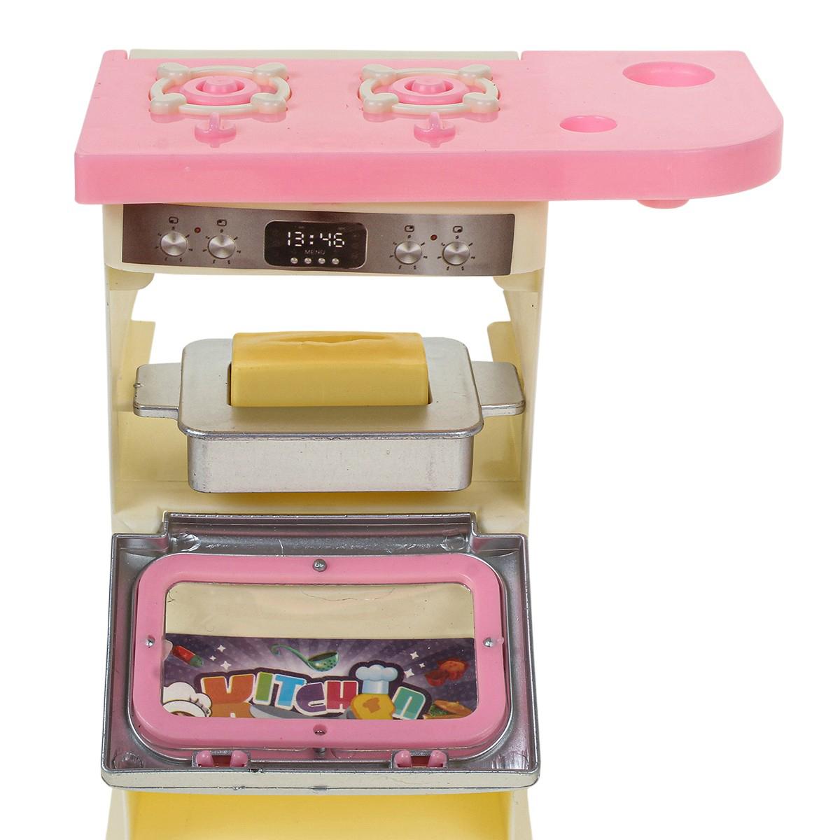 - Игрушечная плита с розовой столешницей, серебристой панелью управления, дисплеем и духовкой с прозрачной дверцей.