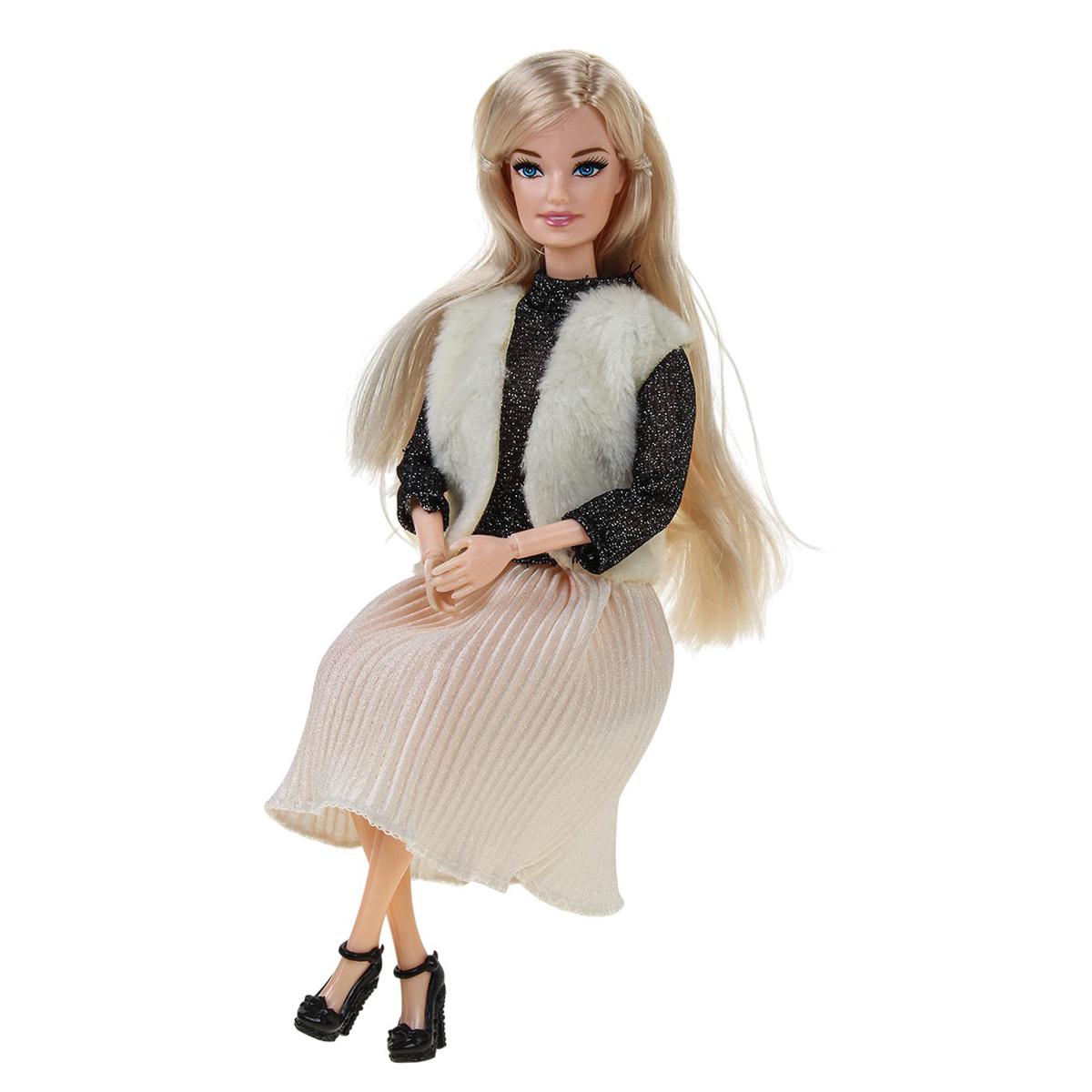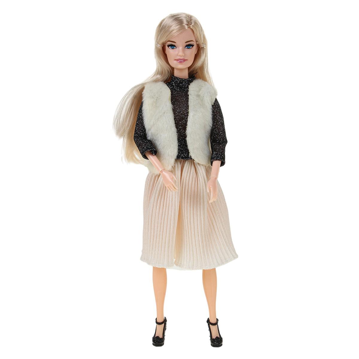 - Кукла высотой примерно 23 см в элегантном наряде: чёрный блестящий топ, светлый пушистый жилет и плиссированная юбка.