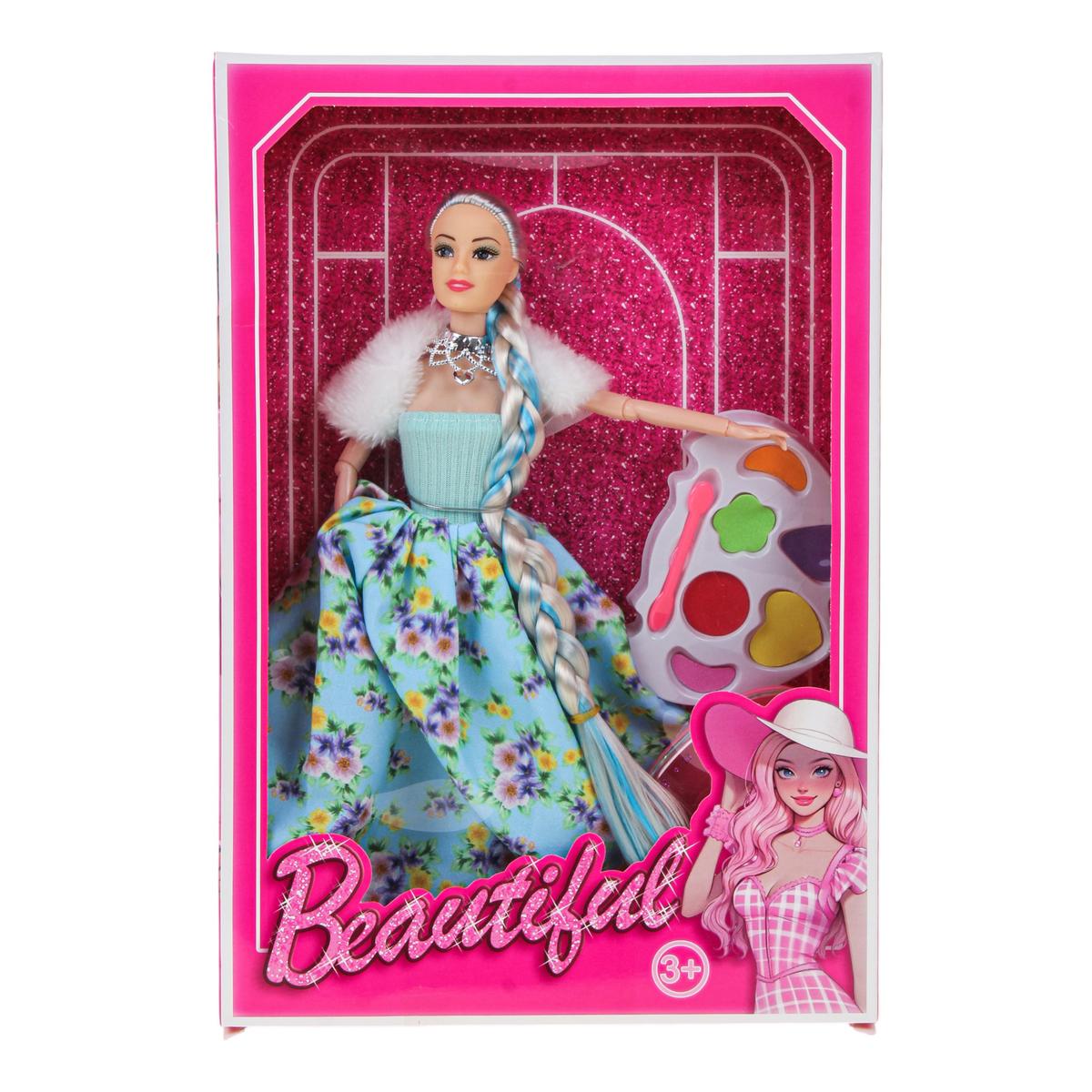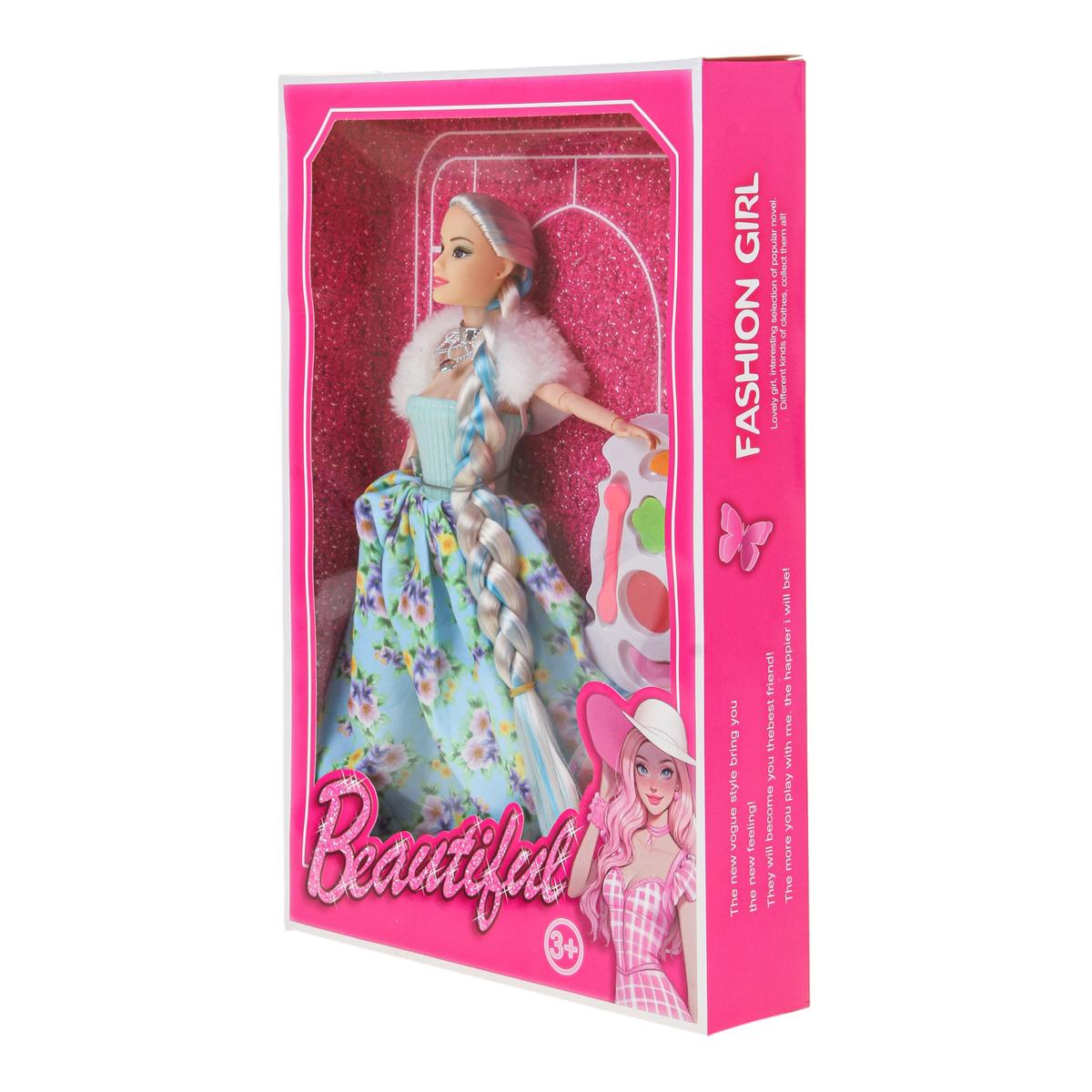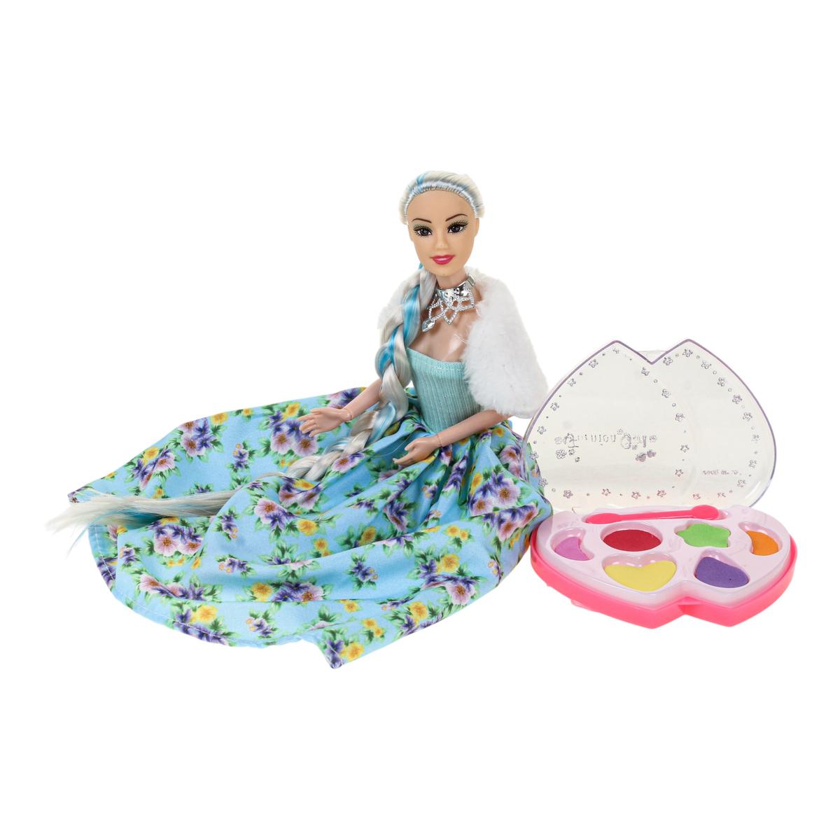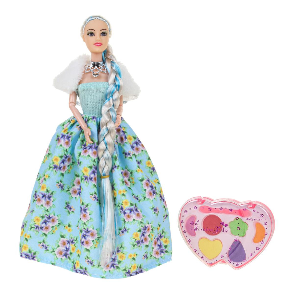 Игрушка изготовлена из пластика и текстиля. Кукла представлена в ярком образе: голубой топ, пышная юбка с цветочным принтом, белая накидка и декоративное ожерелье. Палетка выполнена в форме сердца с прозрачной крышкой и несколькими цветными секциями. Поставляется в красочной коробке, которая подходит для подарка.