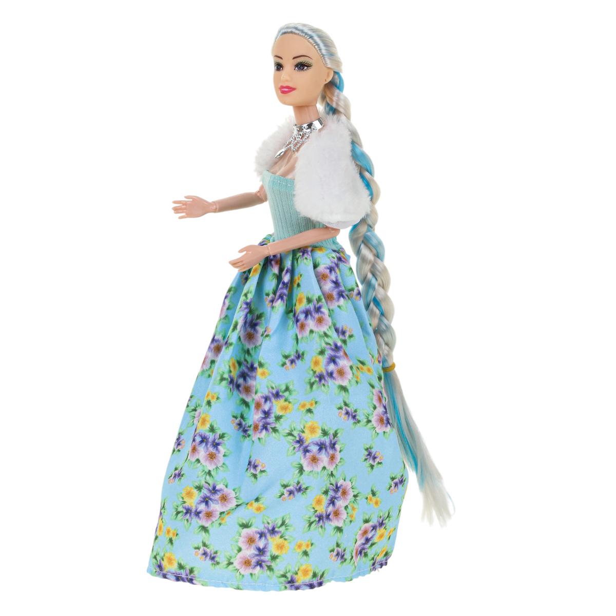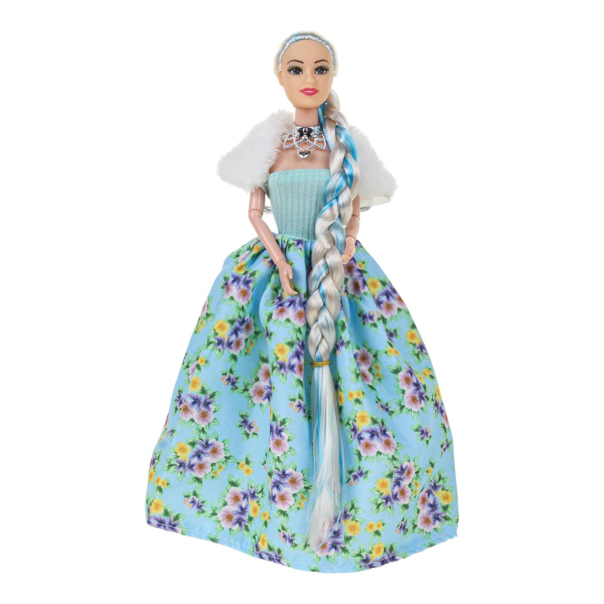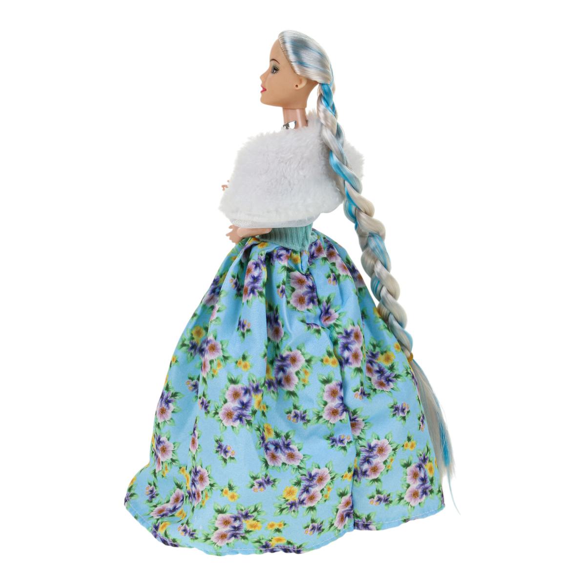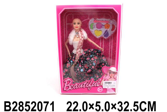 Игрушка изготовлена из пластика и текстиля. Кукла представлена в ярком образе: голубой топ, пышная юбка с цветочным принтом, белая накидка и декоративное ожерелье. Палетка выполнена в форме сердца с прозрачной крышкой и несколькими цветными секциями. Поставляется в красочной коробке, которая подходит для подарка.