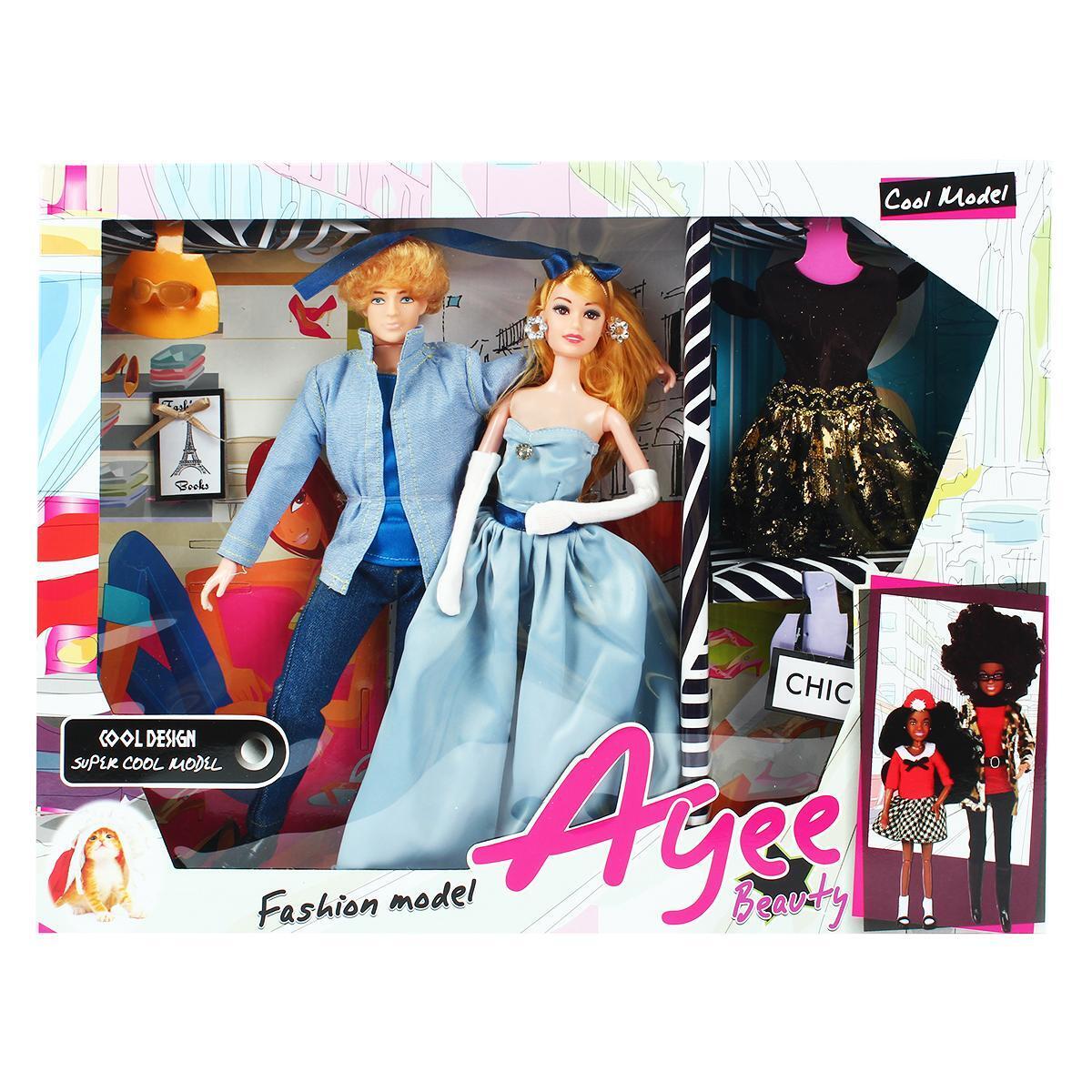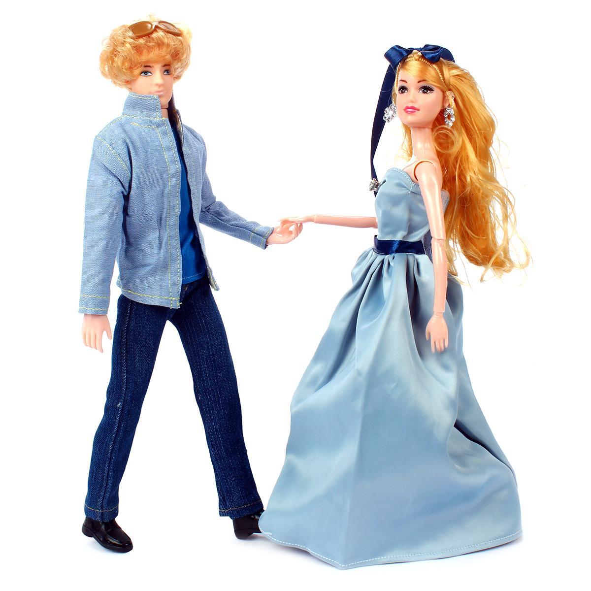 - Гардероб от кутюр: женская кукла в элегантном голубом платье с корсетом и перчатками, мужская — в стильной джинсовой куртке и брюках