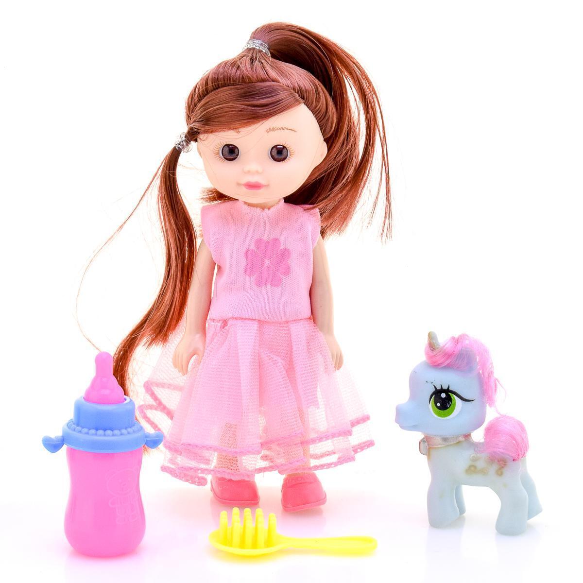 Кукла мини с аксессуарами и пони, рост 28см, каштановые волосы, розовое платье