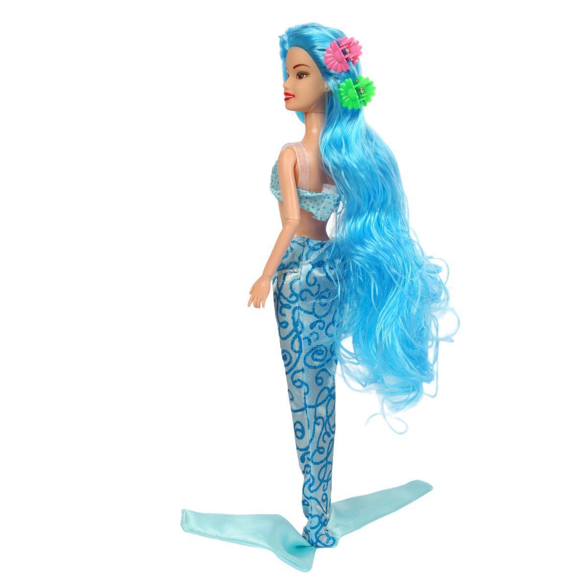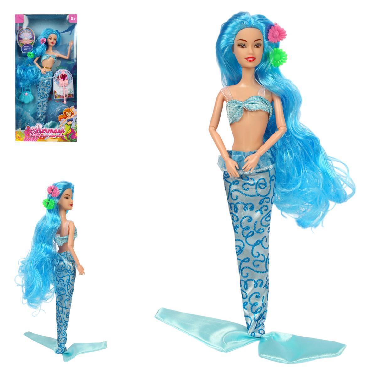 Кукла украшена длинными голубыми волосами, нарядом с хвостом русалки, а также входит в комплект с двумя дополнительными аксессуарами. Прочная упаковка защищает игрушку и делает ее удобной для хранения и транспортировки.