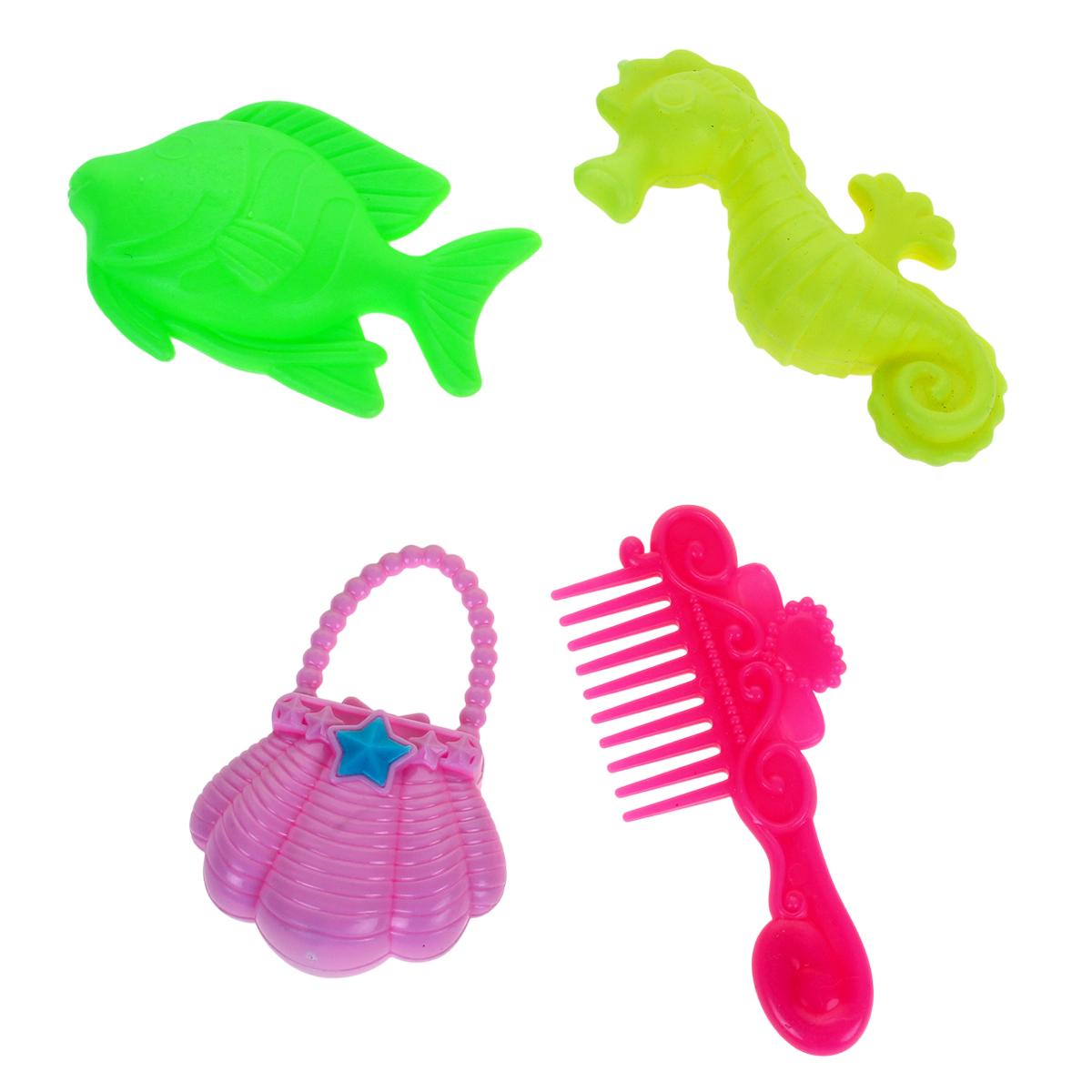 Кукла предназначена для игры как в помещении, так и на улице. Она отлично подходит для сюжетно-ролевых игр, позволяя детям развивать воображение и креативность. В комплект входят дополнительные аксессуары: красная расческа, розовая сумочка в форме ракушки, а также две фигурки в виде рыбы и морского конька, что делает игру ещё более увлекательной.