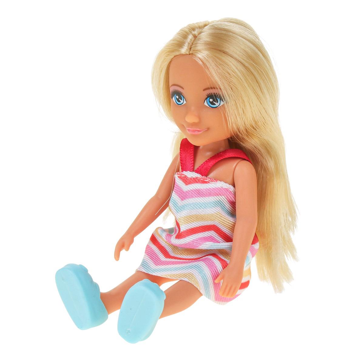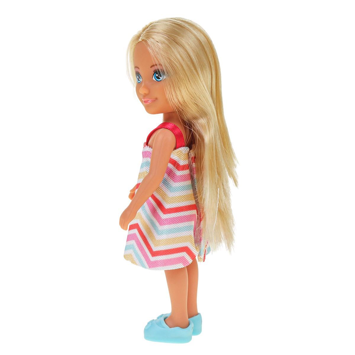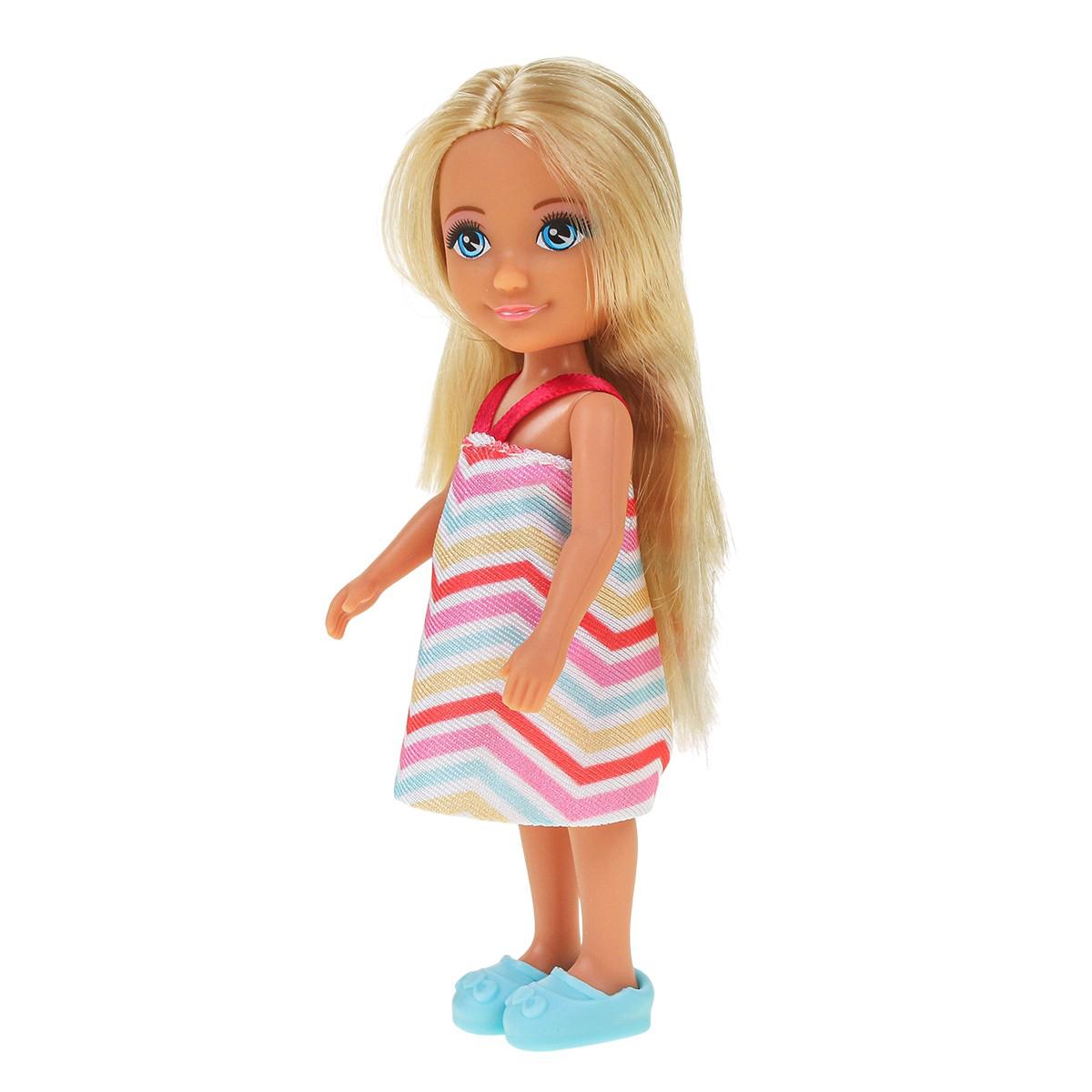 - Стильная модница: Кукла одета в красивое разноцветное платье с зигзагообразным узором, которое сразу привлекает внимание.